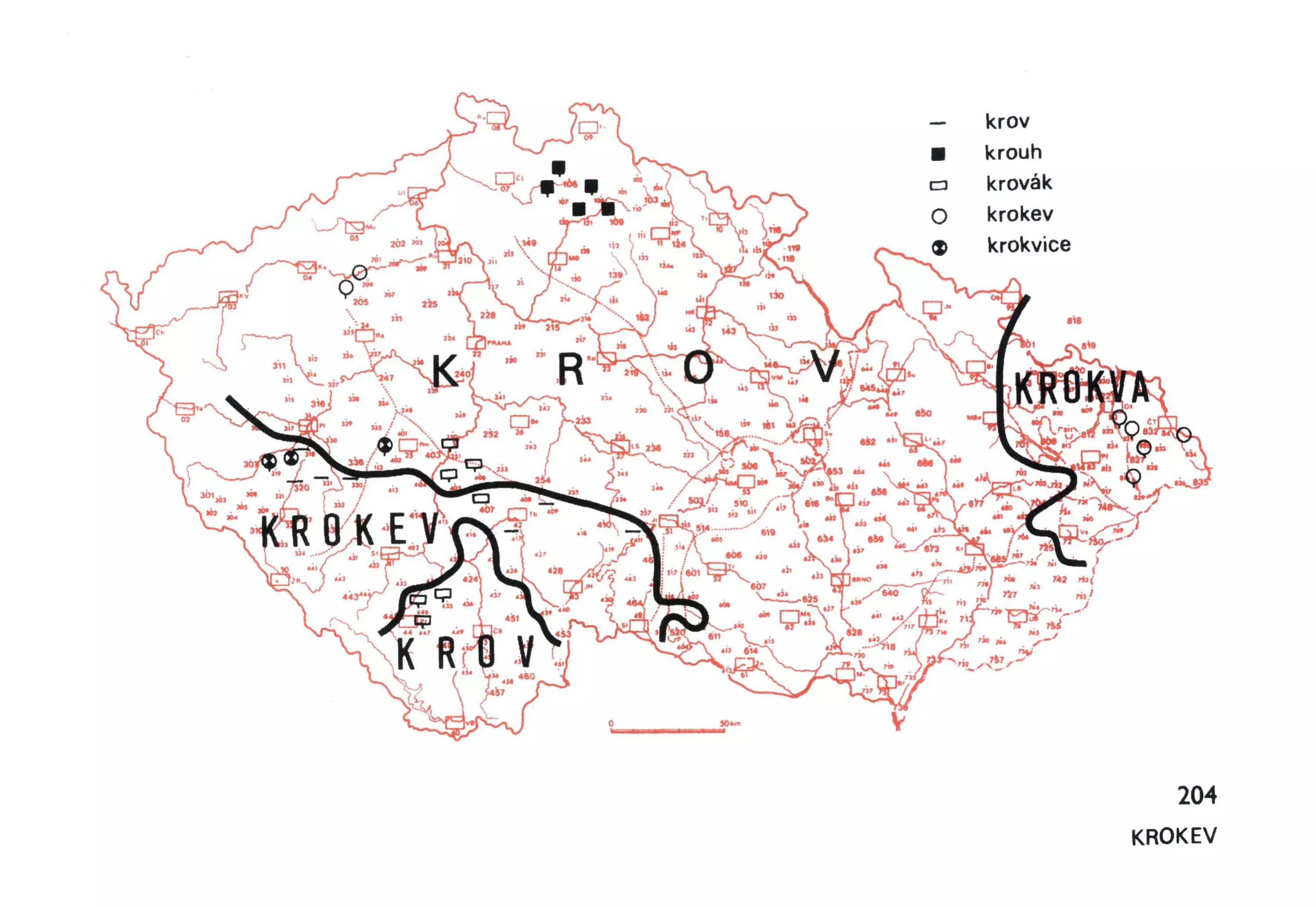 2 Mapa sleduje nář. rozdíly v pojmenování pro krokev, tj. trám v krovu kolmý k hřebeni i k dolnímu okraji střechy, podpírající nosnou konstrukci. Výrazy zapsané při výzkumu se sémanticky mnohdy prolínají. Nejrozšířenější výraz krov mívá totiž význam celé trámové konstrukce střechy, může však označovat také dva spojené trámy (pár), běžně pak i jen trám samostatný. Zeměpisný rozdíl mezi těmito významy se však neprojevil, a proto není na mapě zachycen. Výzkum byl zaměřen na význam ,jeden trám samostatný‘. S tím souvisí ojedinělá explicitní pojmenování půl krovu, pár krovů, která však nebyla do mapy pojata. Celou situaci pak navíc komplikuje ještě časté plurálové označení krovy jako pojmenování dvou spojených krokví, popř. celé nosné konstrukce střechy.