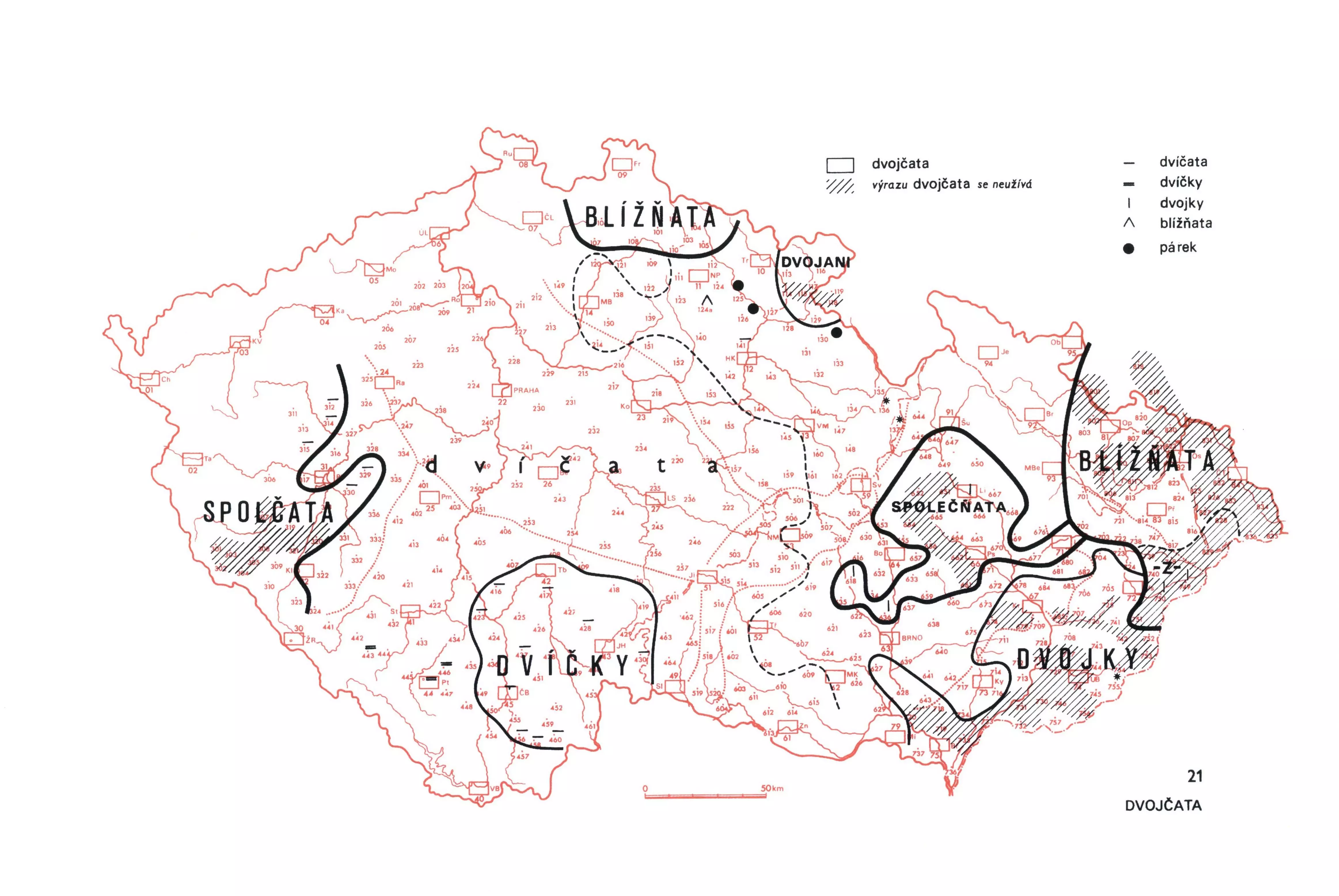 2 Mapa zachycuje nář. pojmenování dvou dětí z téhož porodu. Vedle rozdílů lexikálních byly zapsány též obměny slovotvorné (dvojčata × dvojky × dvojani × dvíčky, spolčata × společňata) a hláskové (dvojčata × dvíčata, blížňata × blízňata).