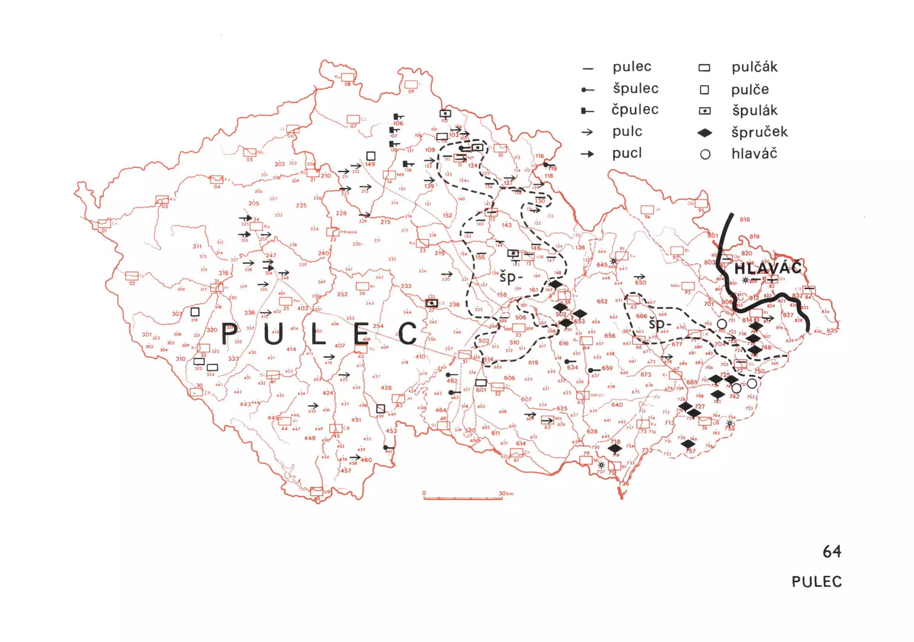 3 Na většině sledovaného území převládá název pulec (a jeho varianty). Jen ve Slezsku se vyskytuje lexém hlaváč, za samostatný lexém považujeme i výraz špruček, který tvoří nesouvislý pruh prostupující středem oblasti vm. nář. a dále se dokládá též ze Svitavska.