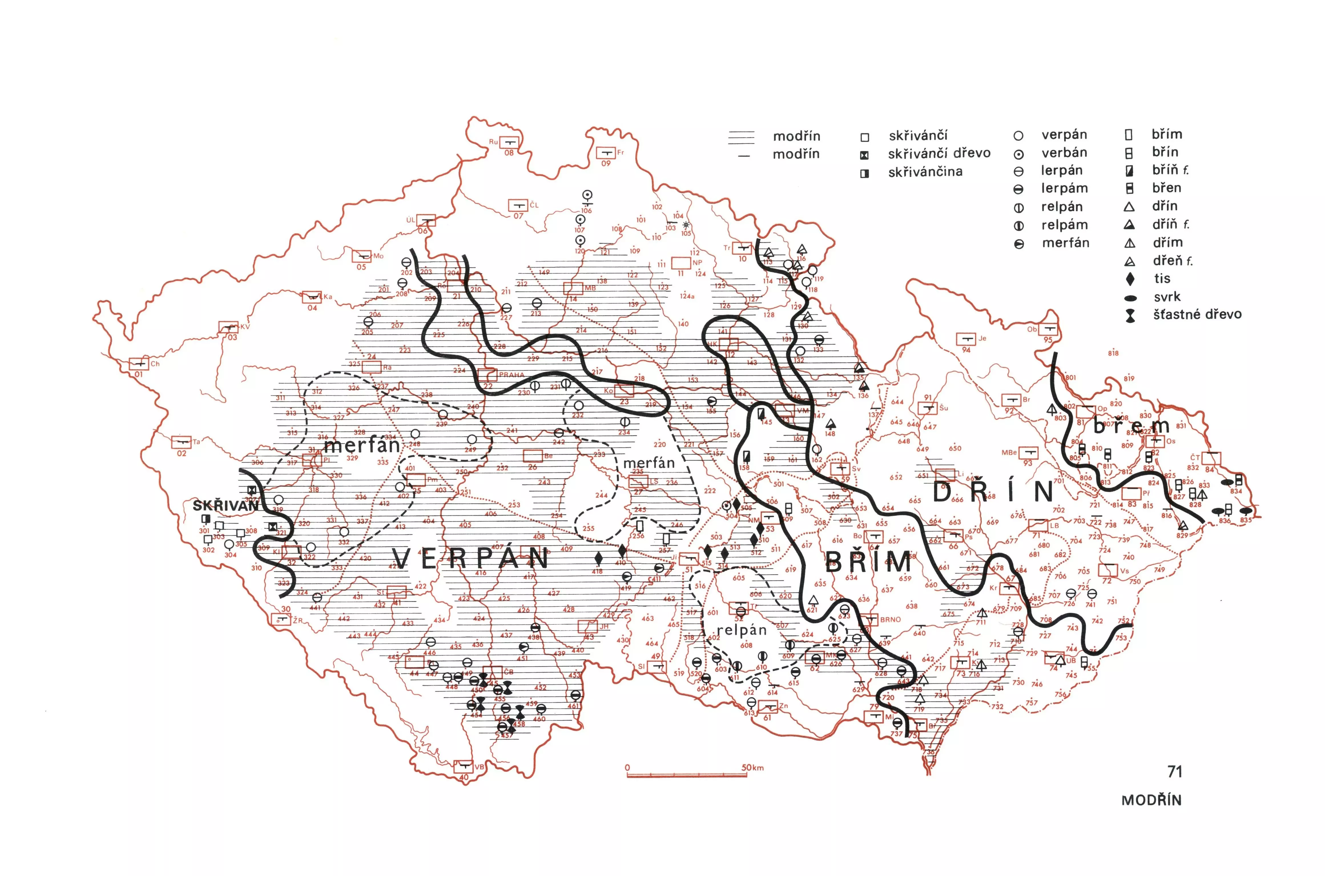 3 Nejrozšířenějším pojmenováním pro modřín je slovo verpán a další četné hláskové obměny. Kromě Domažlicka (zde název skřivan a varianty skřivánčí, skřivánčí dřevo a ojediněle skřivánčina) a sv. okraje pokrývá celé území Čech, odkud přesahuje na jz. Moravu k Brnu a k Břeclavi (zde má zpravidla podobu relpán, popř. relpám, lerpám a lerpán). Hlásková obměna merfán vytváří dvě oblasti: větší v záp. Čechách a menší ve střč. nář. oblasti s centrem na Ledečsku. Na Doudlebsku se setkáváme vedle hláskových variant lerpám a lerpán s dvojslovným pojmenováním šťastné dřevo. V Podještědí byla zaznamenána obměna verbán.
