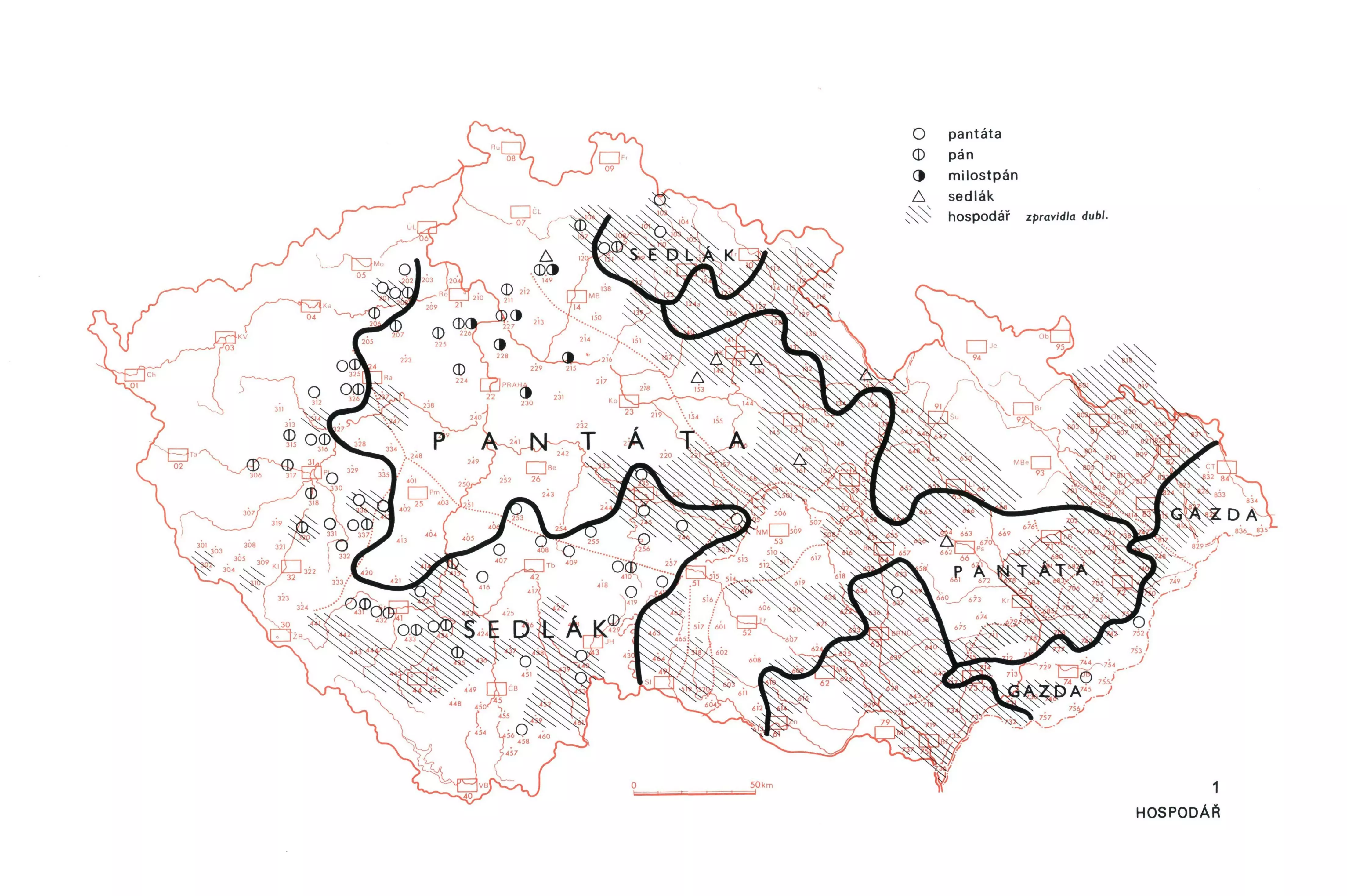 Názvy pro hospodáře se diferencují lexikálně a slovotvorně (pantáta × pantatínek), byly zachyceny též rozdíly typu jednozákladové pojmenování × složenina (pán × milostpán, pán × pantáta). Hláskoslovné diference jsou zanedbatelné, proto je na mapě neregistrujeme.