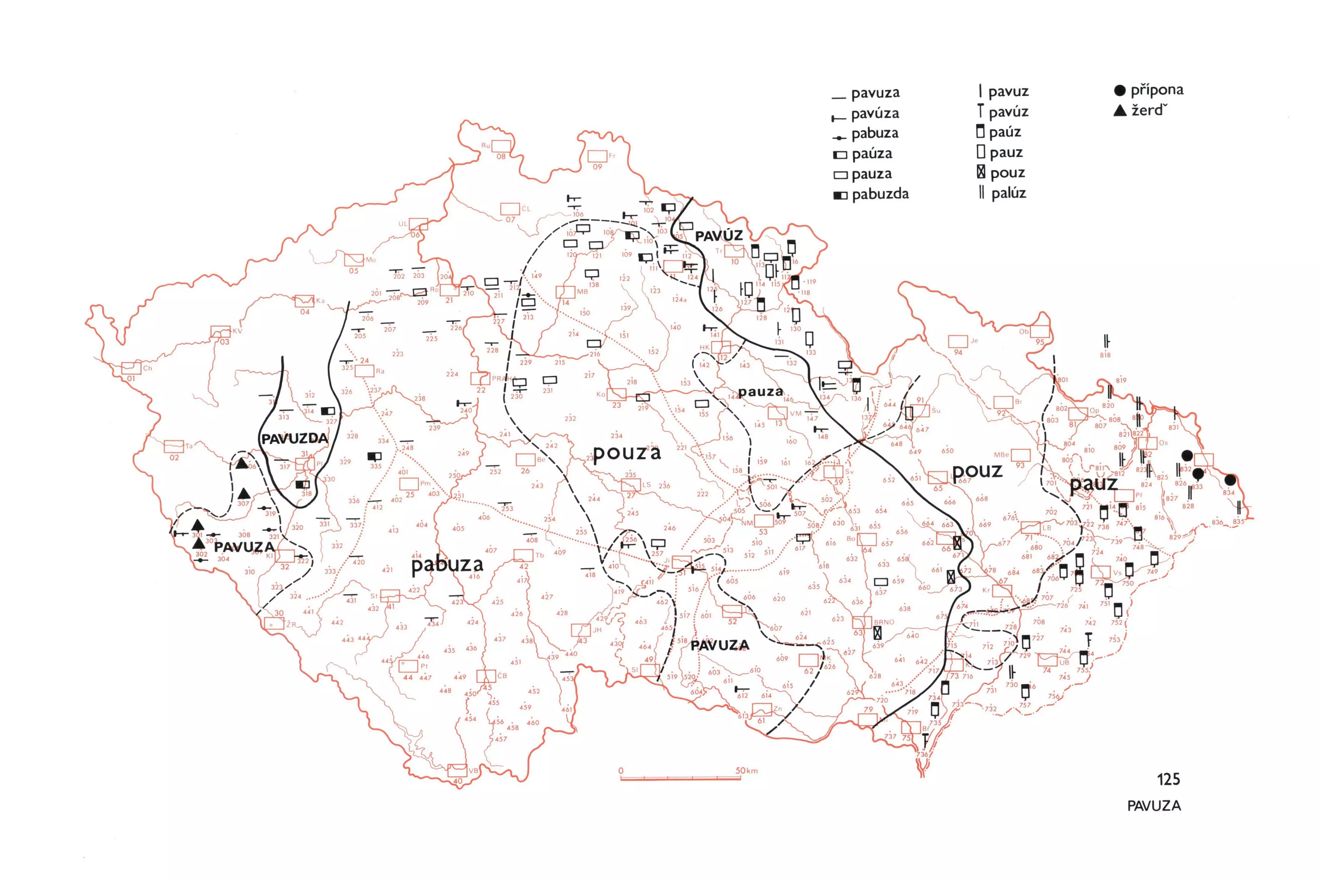 Těžiště nář. diferenciace spočívá jednak v ostře vymezeném rodovém protikladu pavuza f. (tak i spisovně) × pavuz m., jednak v hláskových obměnách těchto rodových variant, jež vznikaly v důsledku vývoje původně dvojslabičné skupiny a-u/ú (podrobněji viz oddíl 4). Podobně se vyvíjí tato skupina i ve slově pavouk, srov. mapu II-57 pavouk. Počet slabik v pojmenování by bylo možno přesně určit jen v slabikách dlouhých; spojení a-u a au nelze pouhým sluchem spolehlivě rozlišit, a proto tento rozdíl na mapě neregistrujeme.