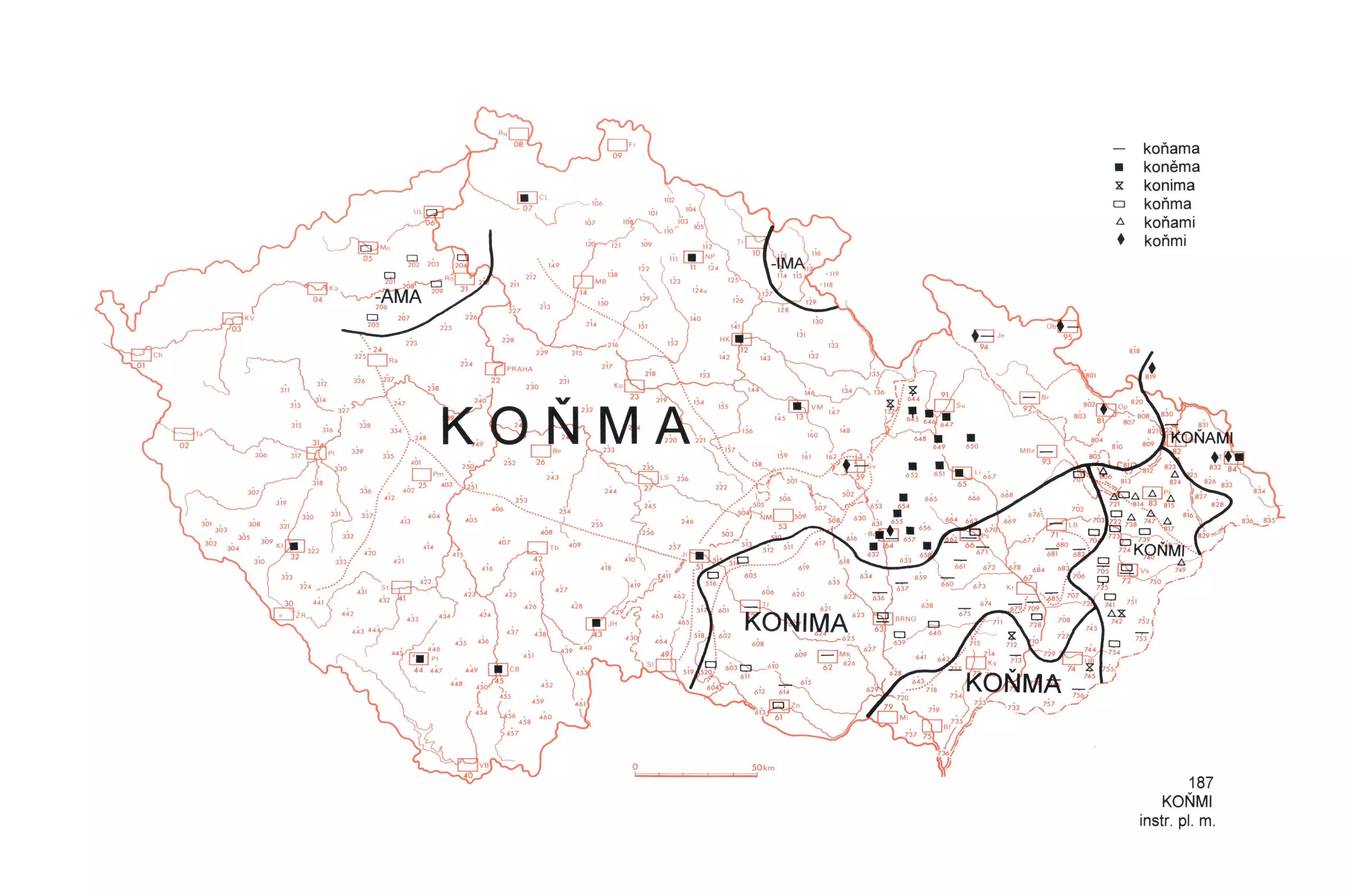 3 Největší rozšíření má forma koňma. Zabírá téměř celé Čechy, celou již. část vm. nářečí, dále Litovelsko se sev. Prostějovskem a Opavsko. (Na větší části Opavska je to jediný případ zakončení substantiv instr. pl. na -ma.)