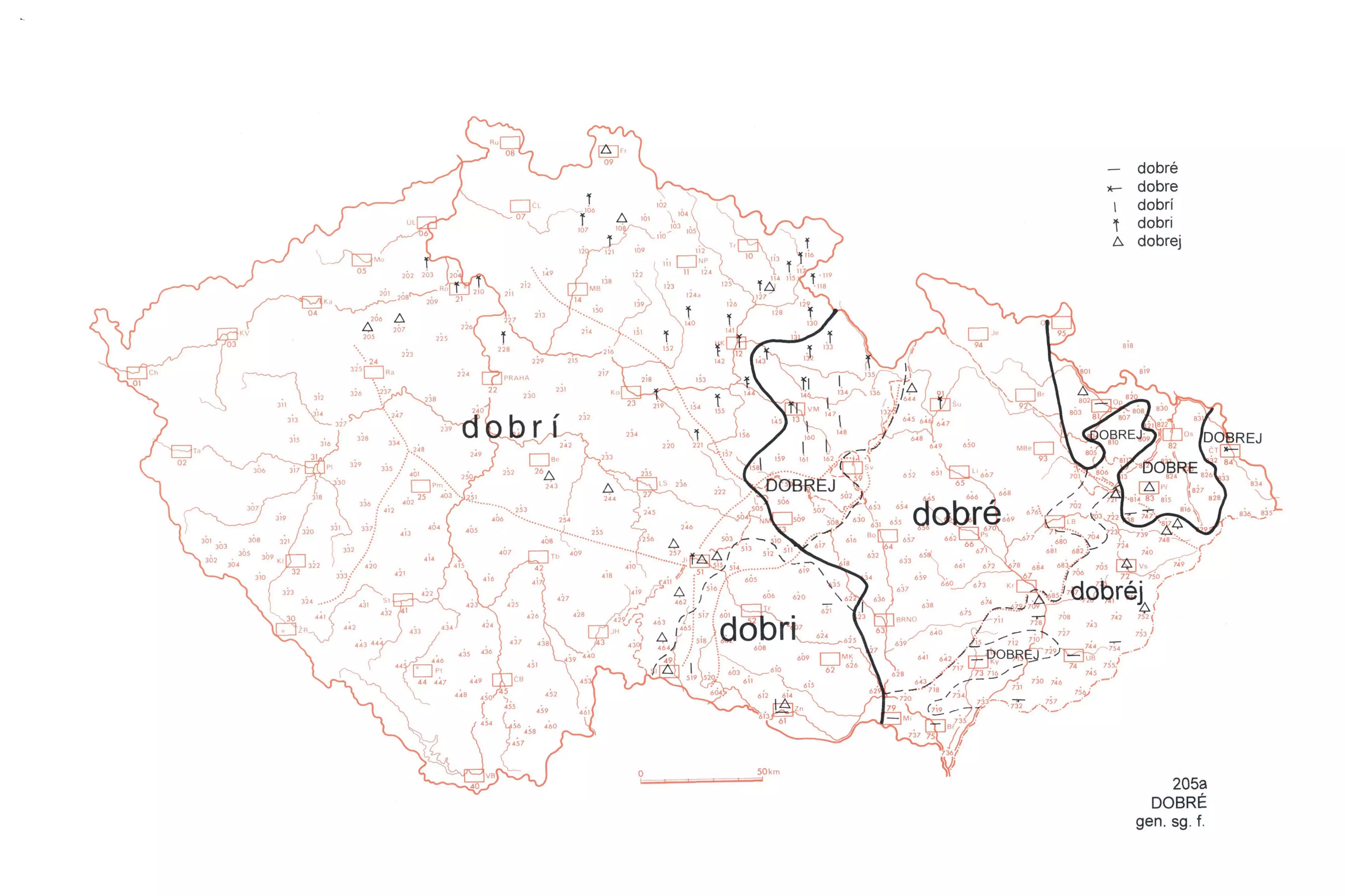3 a) Nejrozšířenější je pův. tvar gen. dobrí (s úženým é > í), který se vyskytuje v celých Čechách (ve vých. části svč. nář. převážně dubletně vedle formy dobrej), v návaznosti pak na jz. Moravě po linii Nové Město na Moravě – Brno – Mikulov (zde v pravidelně krácené podobě dobri). Pův. tvar dobré s nezúženou (avšak pravidelně krácenou) koncovkou byl zachován v sev. a stř. pruhu slez. nář., zahrnujícím záp. Opavsko, Hlučínsko, Příborsko a ostravický úsek.