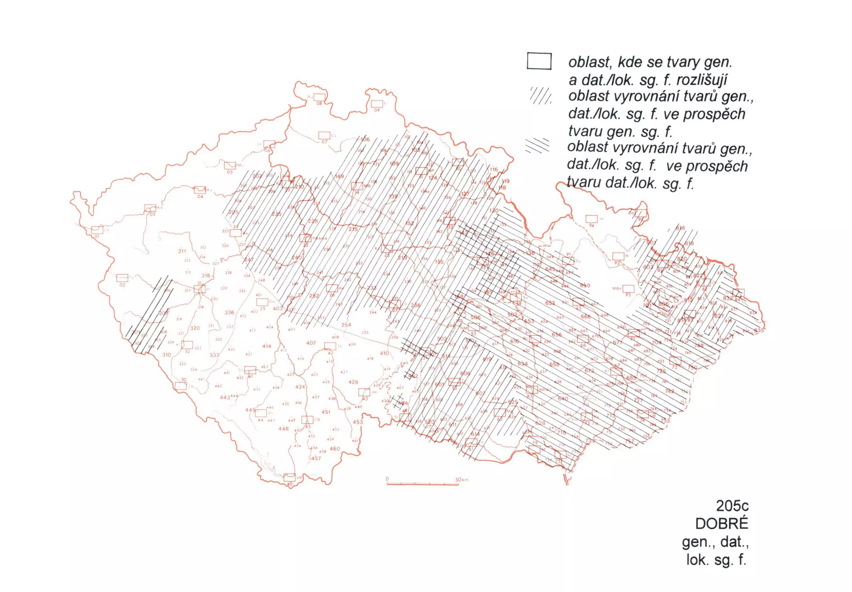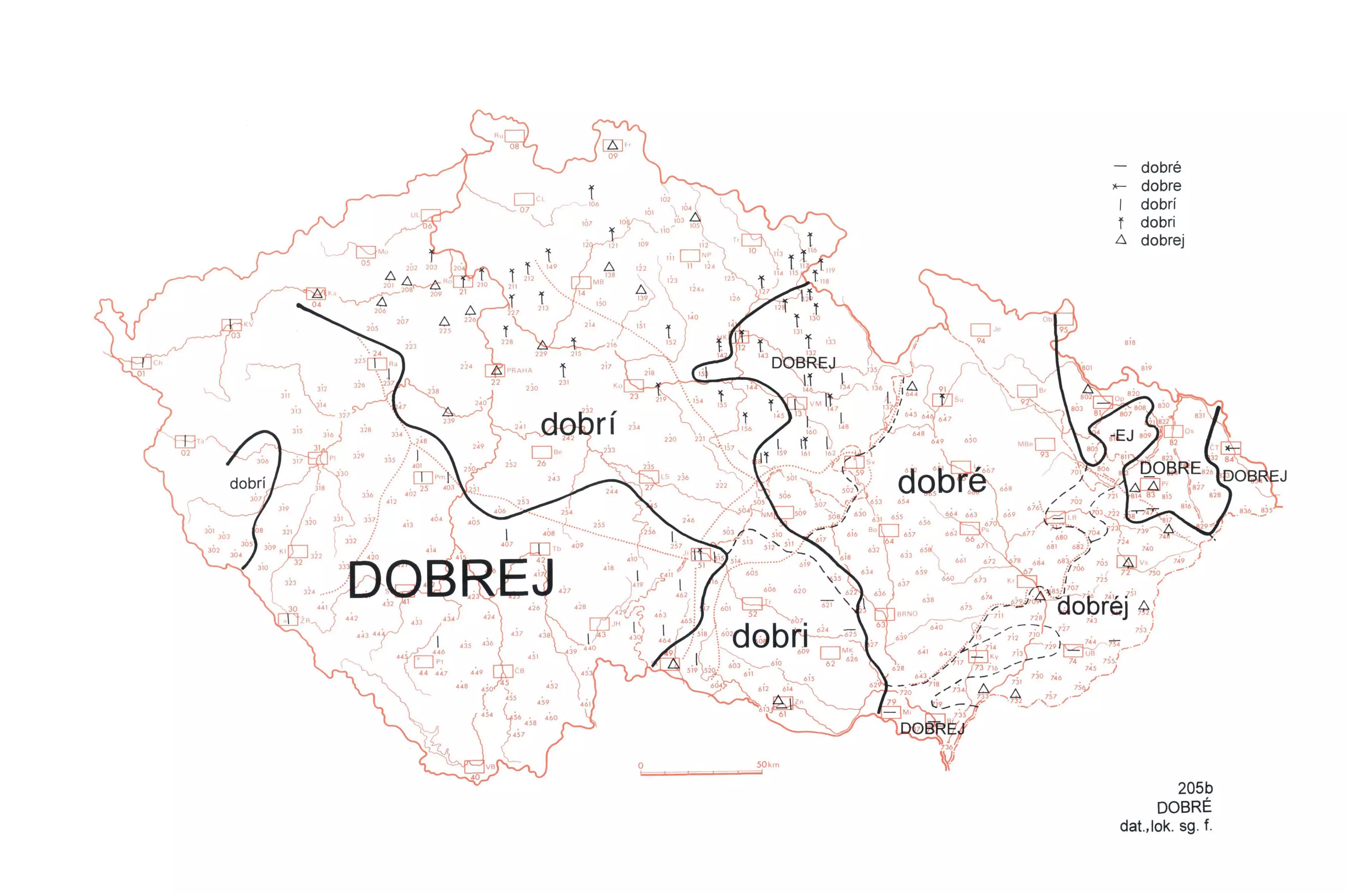 b) Mapa dat. a lok. sg. f. se od mapy gen. sg. f. odlišuje zvláště situací v oblasti jzč. nář. bez Chodska. V této části Čech je rozšířen převážně jako jediný tvar dat. dobrej. Ten byl též častěji zachycen jako dubletní v Poohří.