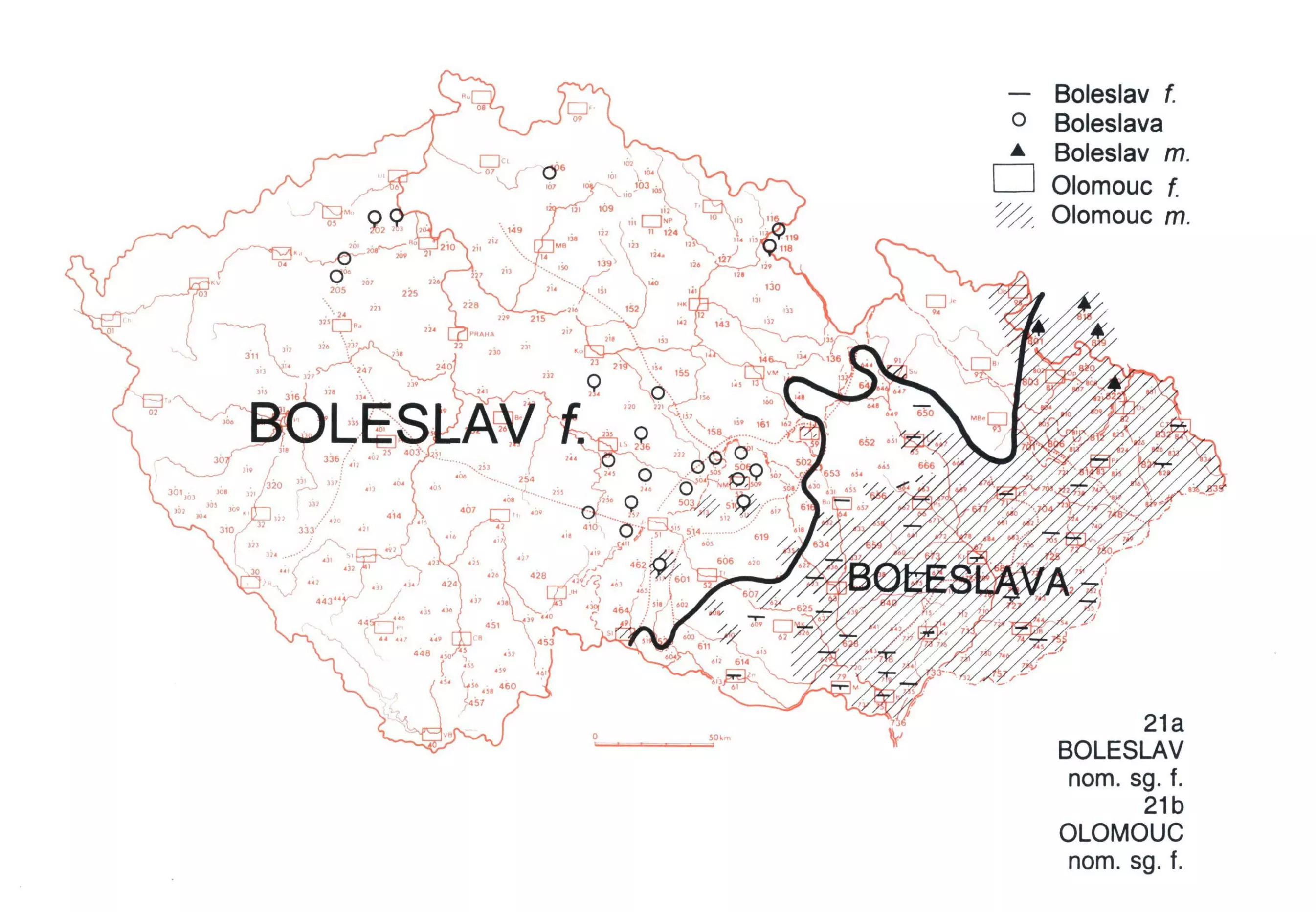 2 Mapa sleduje podoby nom. sg. místního jména typu Boleslav. Jména na -slav/-clav (Čáslav, Břeclav) jsou ve spis. jazyce rodu ženského (na Moravě se tento typ zkoumal převážně na jméně Břeclav). Původně byla tato jména (podobně jako propria na -im/-am, srov. ČJA 4, 22 Příbram) mužskými jmennými tvary adjektiv přivlastňovacích, a skloňovala se proto jako substantiva typu muž. Později došlo k přechodu k femininům, a to k typu kost, popř. píseň. Ve východnějších nářečích se později dotvořil produktivní nom. sg. Boleslava (vzor žena). K okolnostem tohoto přechodu srov. ČJA 4, 52 Boleslavi gen. sg. f.