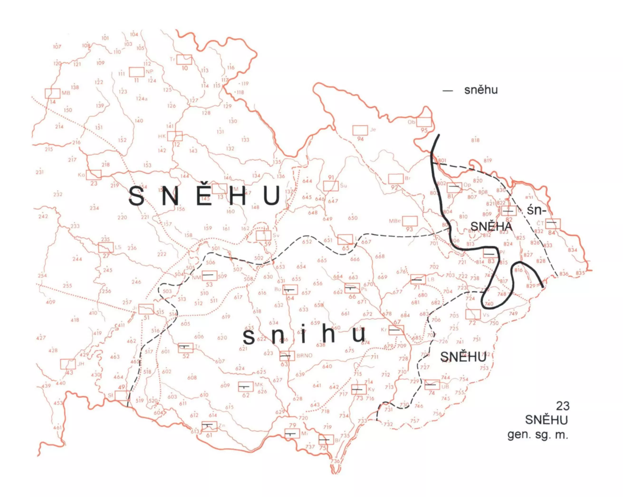 3 Starší, původní forma sněha je omezena jen na oblast slez. nářečí (s malým přesahem na Valašsko). Nepůvodní tvar na -u je na celém zbylém území. Obměna snihu zabírá v podstatě území střm. dialektů (bez Zábřežska), na východě značně přesahuje do nářečí vm., zejména do jejich již. části. Na přechodová nářečí čes.-pol. se omezuje podoba śněha.