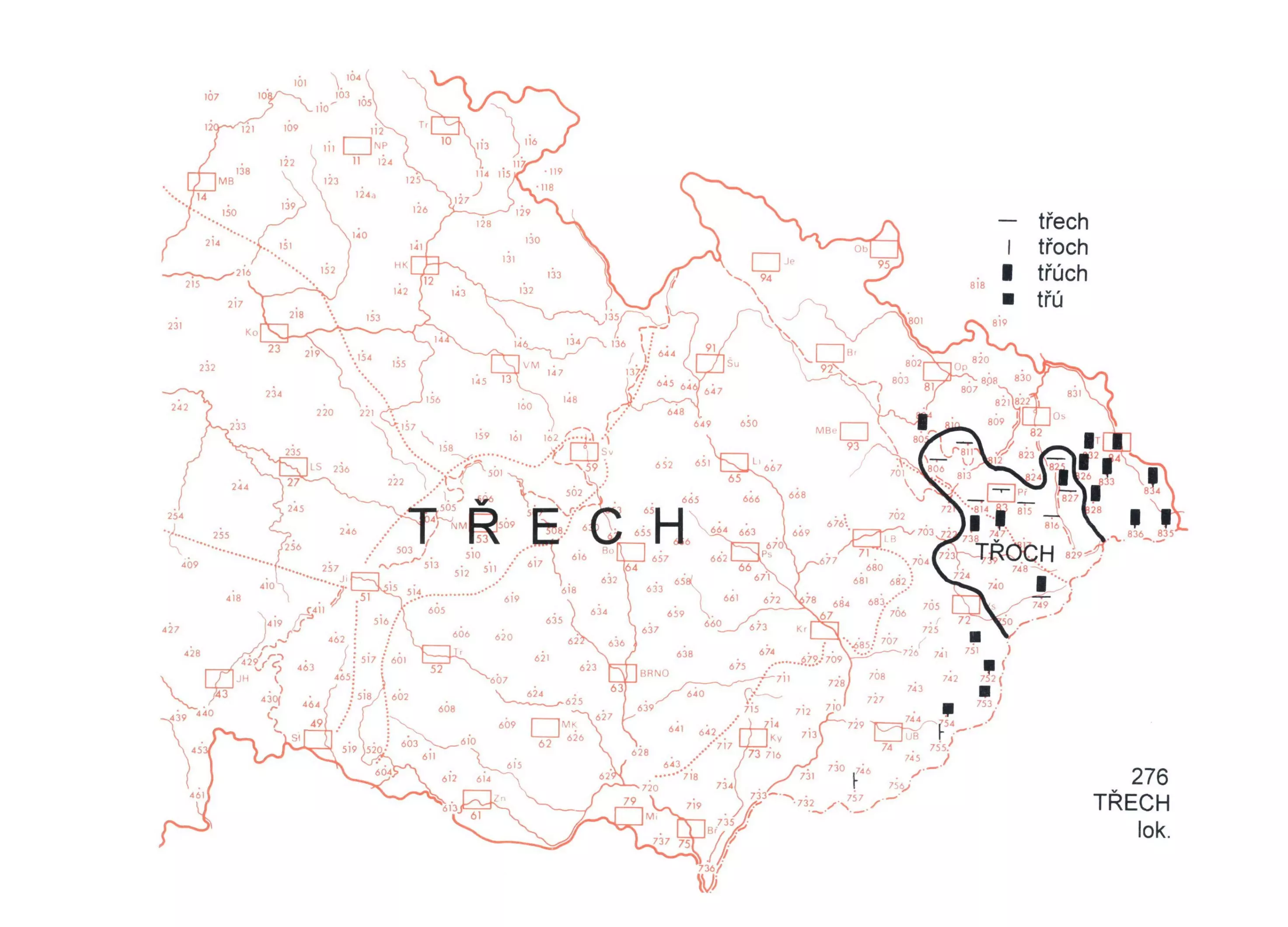 3 Na celém území je základní tvar gen.-lok. třech. Nář. varianty se soustřeďují pouze na východě území. Nejfrekventovanější z nich je podoba třoch, zachycená na sev. části Valašska a v přilehlém úseku sousedních nář. slez. Na mapě je zakreslen maximální výskyt tohoto zakončení, a to v lok., areál výskytu této koncovky v gen. byl o něco menší, na Příborsku se v genitivu místo třoch užívá i formy třech.