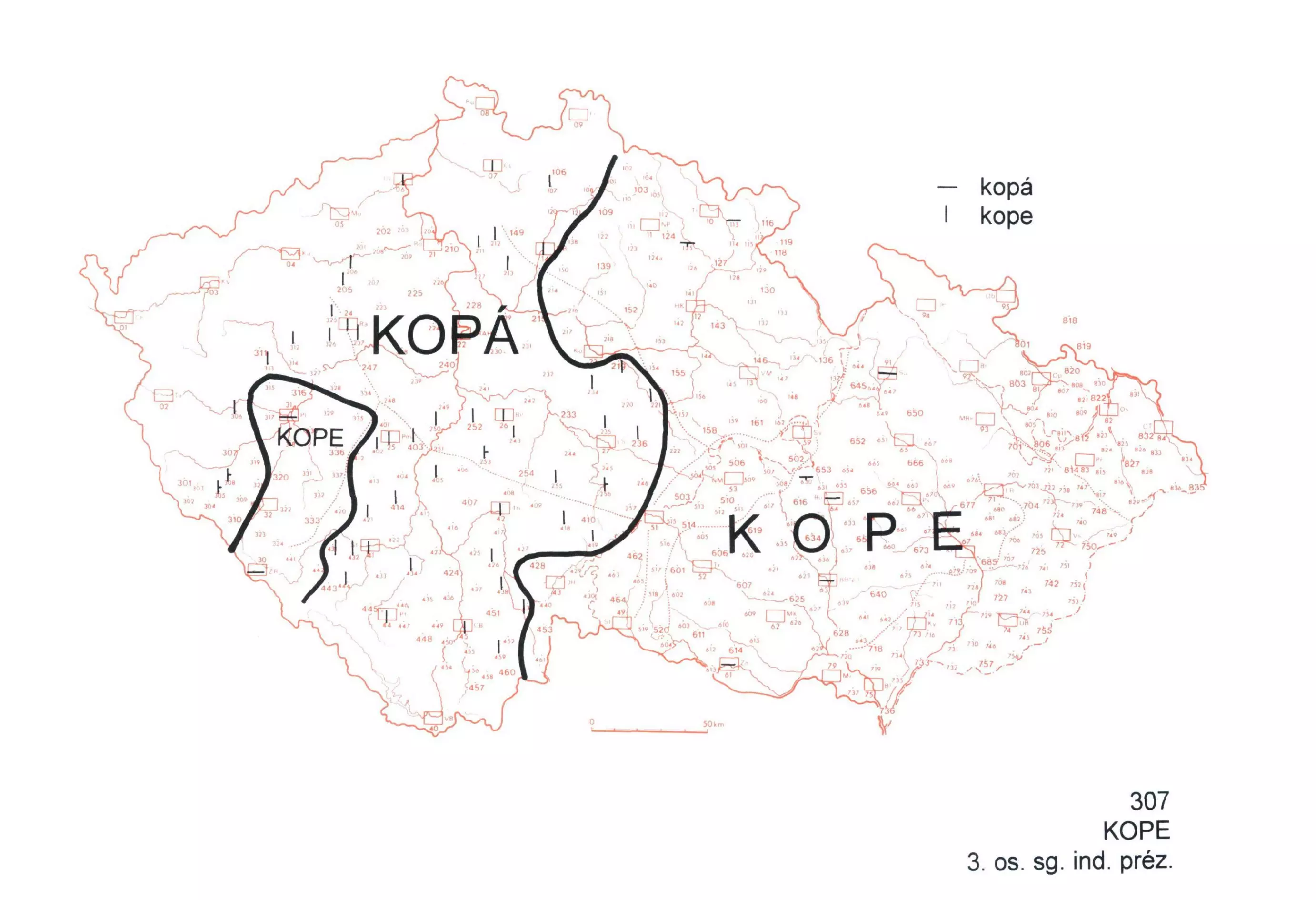 2 Mapa zachycuje územní rozšíření tvarů 3. os. ind. préz. kope a kopá. Pův. tvar se řadí k slovesům 5. třídy kopá. Forma 1. třídy kope je novotvar (není doložen v stč.). Obě podoby jsou hodnoceny jako spisovné.