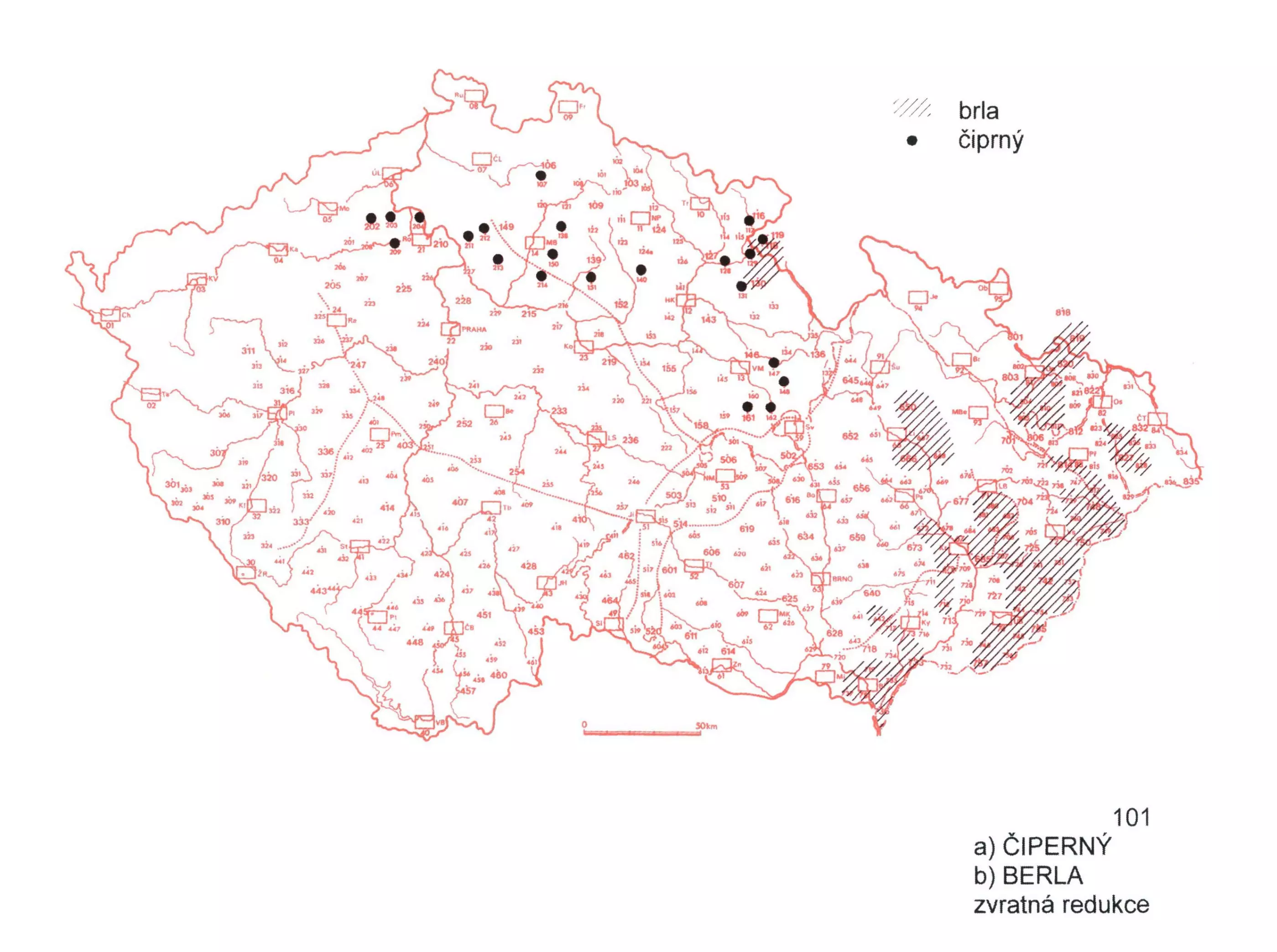 2 Na mapě jsou šrafami a značkami pozitivně zobrazeny areály podob čipný a bla; v těchto případech vzniklo zvratnou redukcí ze skupiny -er-.