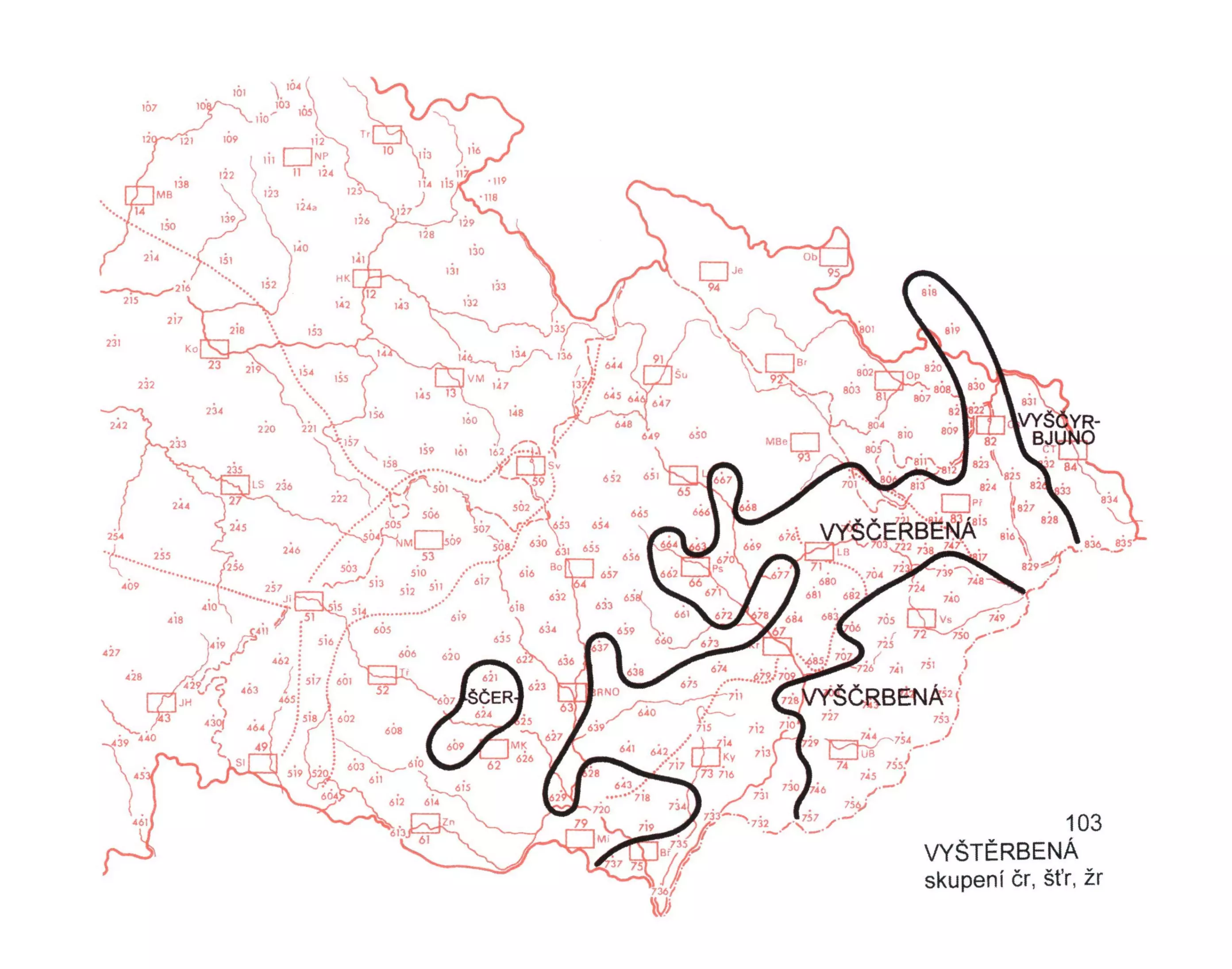 3 Podoba vyščbená pokrývá stř. část vm. nář. a vých. Valašsko. Ze zbývající části vm. nář. (s výjimkou území sev. od Břeclavi) a z několika menších areálů ve střm. a slez. nář. se dokládá varianta vyščerbená. Pro přechod. nář. čes.-pol. je typická forma vyščyrbjuno.