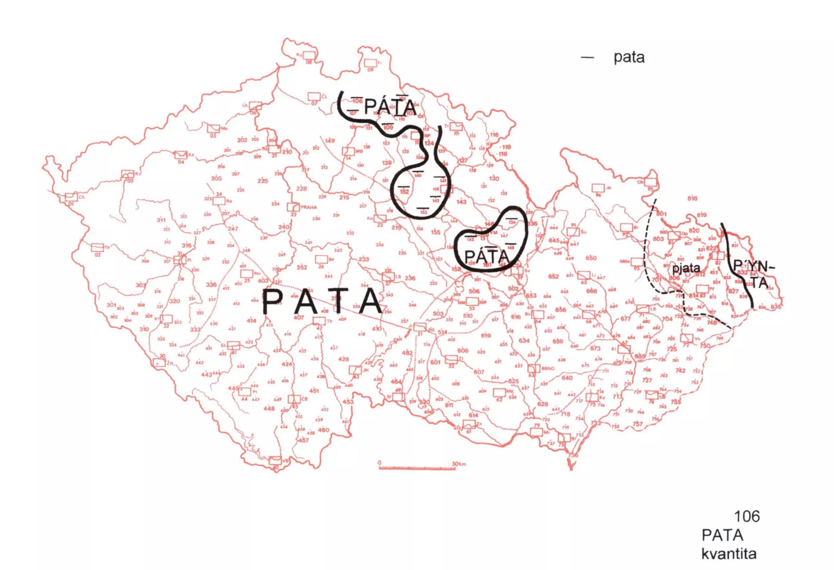 2 Mapa zachycuje dloužení kořenné samohlásky u slov kraj a splav. U slova kraj se vedle sledovaného dloužení a > á, tj. kraj × kráj, na mapě objevuje ještě podoba kroj, která též svědčí o starém dloužení a > á (dalším vývojem á > o, srov. ČJA 5, 69 dobrá). (Nemapována zůstala podoba kré na sv. okraji střm. nář., kde -é zřejmě vzniklo střm. monoftongizací diftongu -ej po předchozí změně aj > ej, jež byla jinde analogickým vyrovnáním s nepřímými pády odstraněna, srov. ČJA 5, 40b).