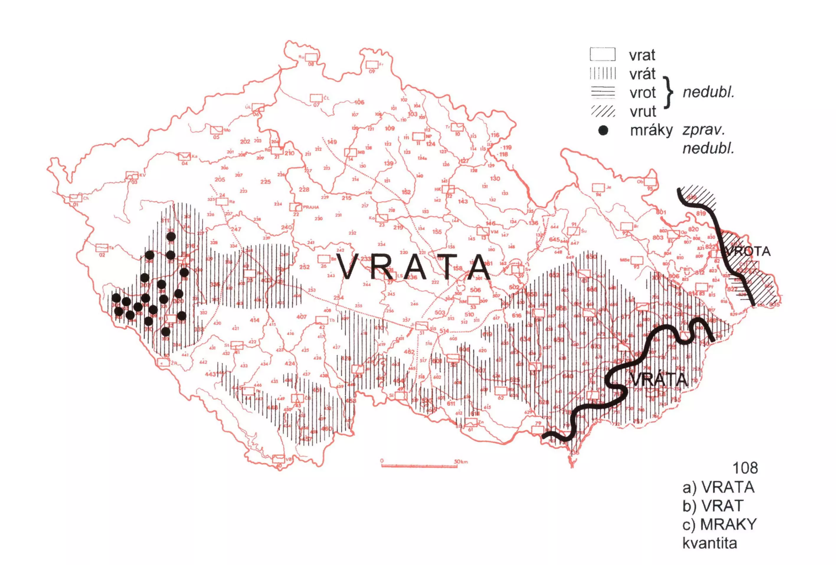3 Podoba vráta zaujímá větší část vm. nář. (bez jz. a sev. okraje) a podoba vrota čes.-pol. přechodová nářečí. Na celém ostatním území čes. jazyka byla zachycena pouze podoba vrata, shodná se spis. jazykem. Města se shodují s nářečním okolím.