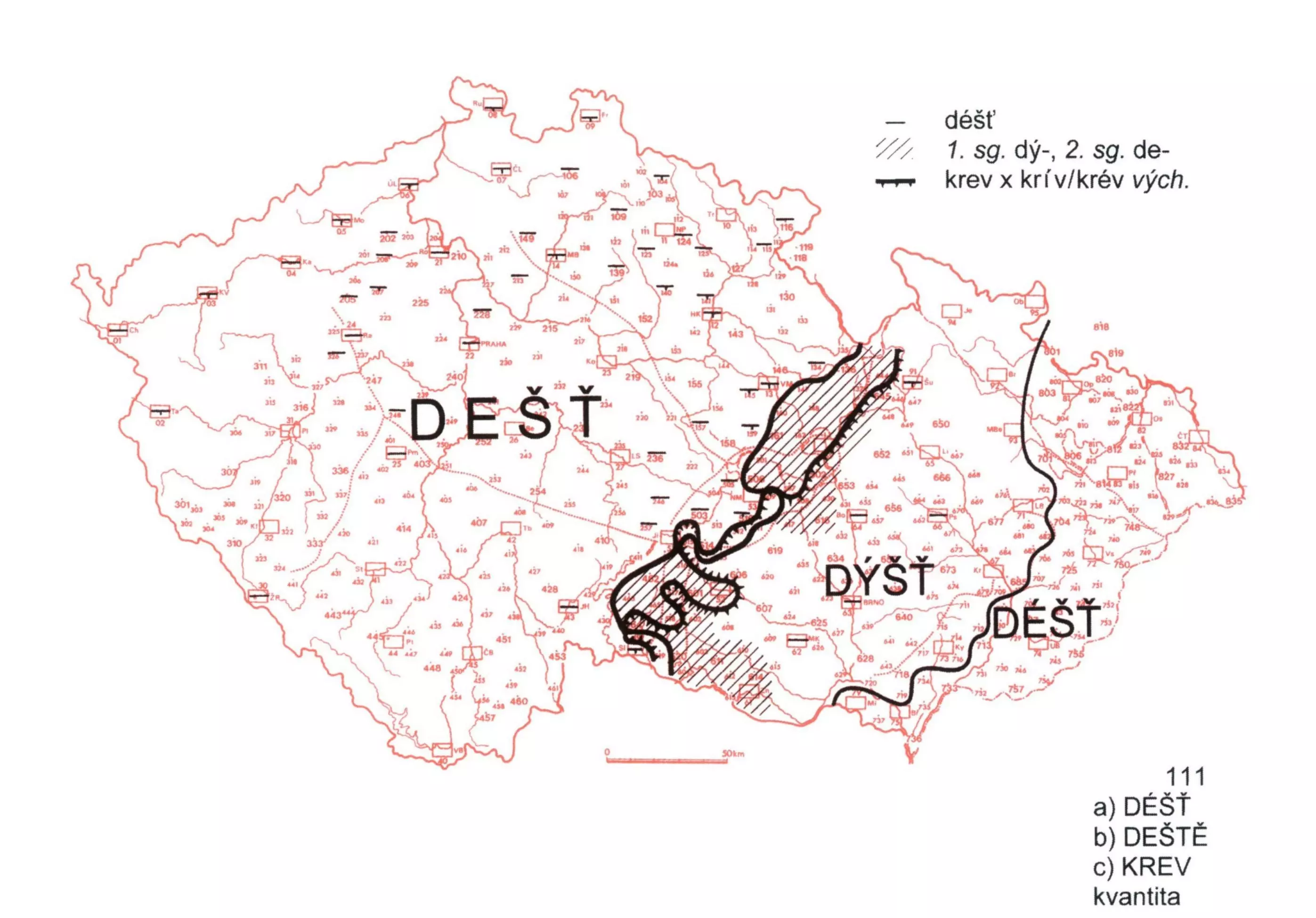 3 Hlavním problémem mapy je položka déšť. Téměř v celých Čechách (bez nejvýchodnějšího okraje svč. nář.) a na Novoměstsku se užívají podoby s krátkou kořennou samohláskou, tedy zpravidla dešť, jen na sz., sev. a vých. okraji se jako dubletní objevuje i podoba déšť (obě jsou hodnoceny jako spisovné). Dále na Moravě převažují podoby se starší délkou (ve většině vm. nář. déšť, ve střm. nář. vyjma oblastí s pravidelným novějším krácením, na vých. okraji svč. nář. a na záp. okraji vm. nář. dýšť).