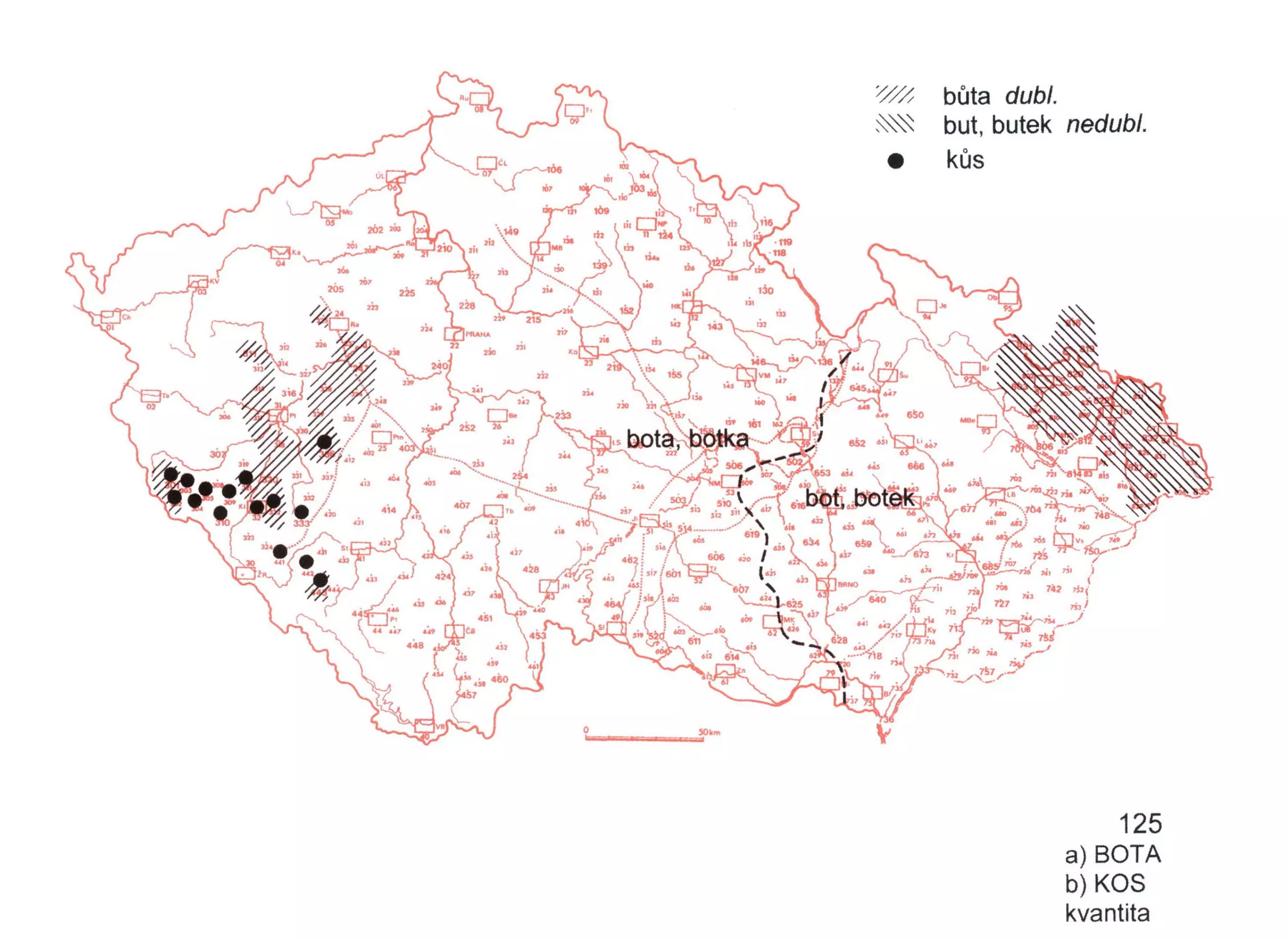 Pro snazší představu čtenáře o celkové situaci je na mapě zachycen i rodový rozdíl bota, botka × bot, botek; u druhé mapované položky je pozitivně zobrazena jen zdloužená podoba kůs.