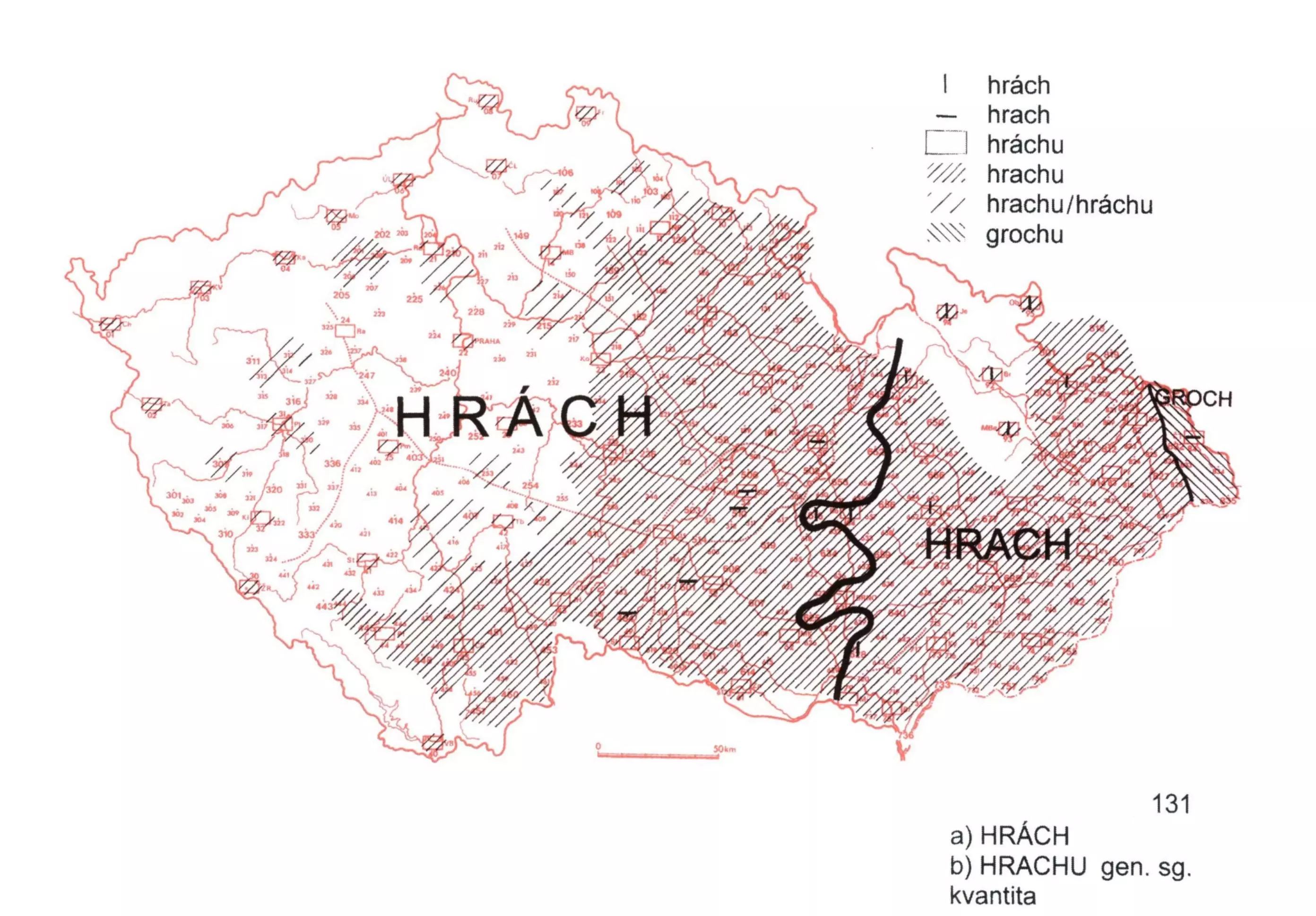 3 Izoglosa mezi podobami hrách a hrach vede středem střm. nářeční oblasti (po linii Šumperk– Boskovice–Brno–Mikulov), na východ od této izoglosy je rozšířen zkrácený tvar hrach, ten byl sporadicky zachycen i na Novoměstsku, Třebíčsku a Slavonicku. Pro oblast přechodových nář. čes.-pol. je typická obměna groch. Města se většinou shodují s nář. okolím, jen do sm. měst častěji jako dubletní proniká podoba hrách, shodná se spis. jazykem.
