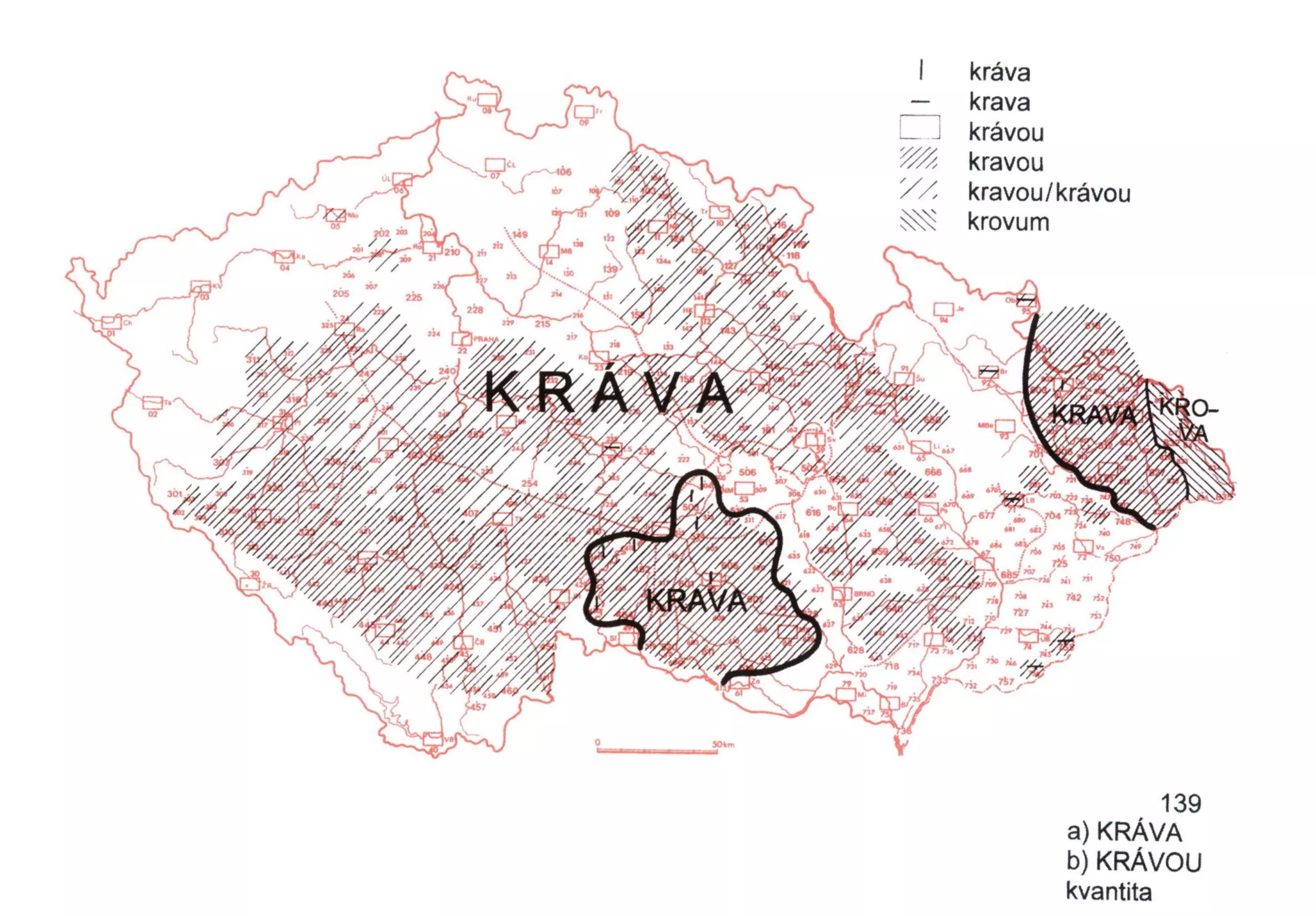 3 Varianta s krátkou samohláskou krava vytváří dva od sebe oddělené areály, jeden na jz. Moravě s přesahem do vých. části jzč. nář. (zhruba mezi městy Slavonice, Jindřichův Hradec, Jihlava, Nové Město na Moravě, Moravský Krumlov a Znojmo), druhý pak ve Slezsku (v oblasti přechodových nář. česko-polských byla zapsána obměna krova). Na ostatním území čes. národního jazyka se vyskytuje rozšířenější podoba kráva, shodná se spis. jazykem. Města se většinou shodují s nář. okolím.
