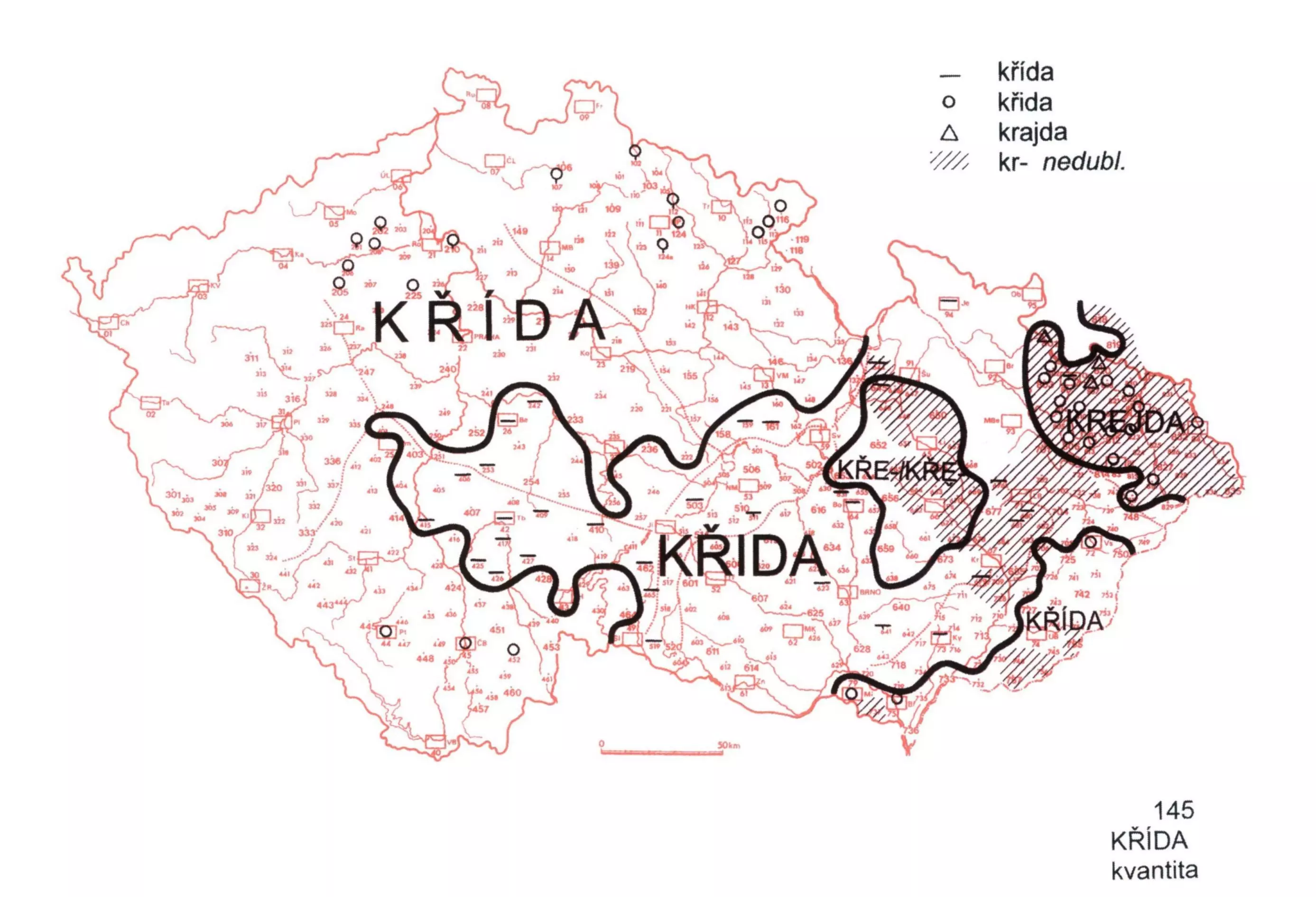 3 Podoba křída se vyskytuje na téměř celém území Čech (v úseku mezi Benešovem, Příbramí a Jindřichovým Hradcem a na sev. a sz. okrajích Čech v dubletě s variantou křida), dále byla zachycena ve vých. okrajových oblastech vm. nářečí. Na zbývajícím území (s výjimkou přechod. čes.-pol. pruhu) se objevuje obměna křida (ve vých. pruhu střm. nářečí, v okolí Lipníka nad Bečvou a v kopaničářských nářečích ve variantě krida). Na centrální Hané se objevují hláskové varianty kředa/kreda, křda/ krda.