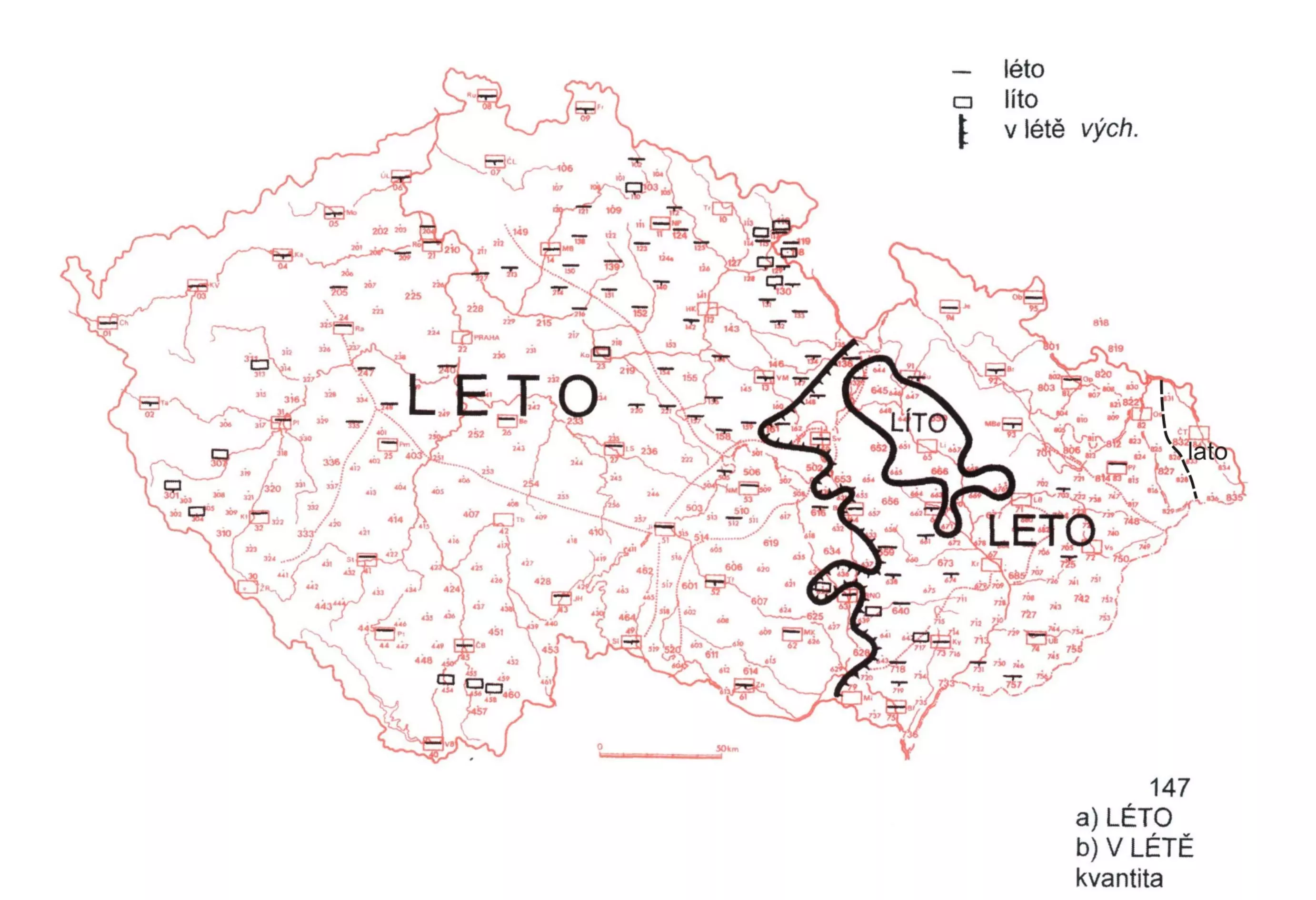 2 Na mapě je zachyceno územní rozšíření podob s délkou a krátkostí v první slabice dvojslabičného neutra léto ‚roční období‘ (psl. *lěto), a to u forem nominativu sg. a lokálu sg.