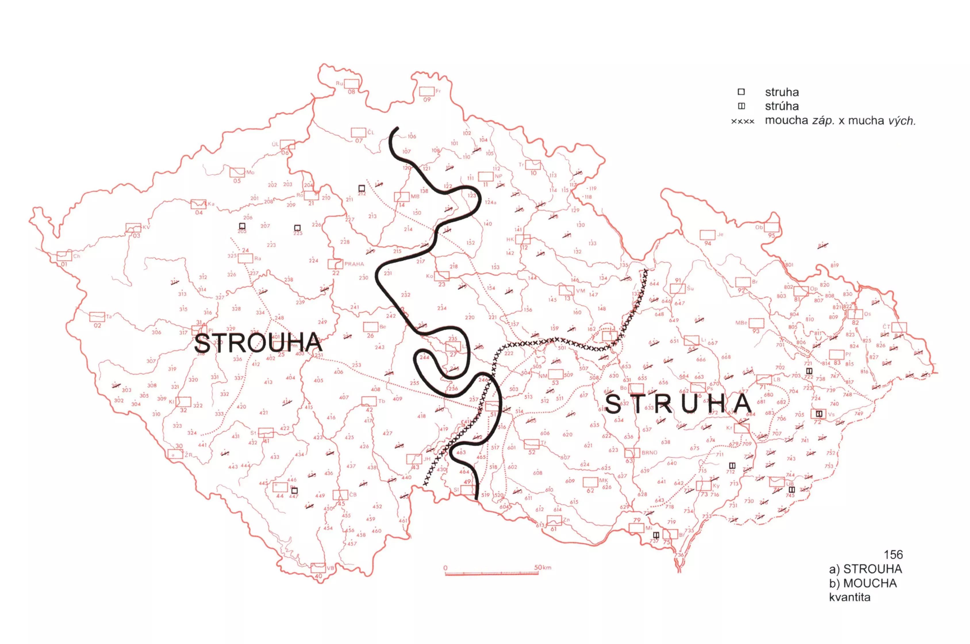 3 Podoba struha se vyskytuje v svč. dialektech (s výjimkou širokého Mladoboleslavska), v záp. polovině střč. nářečí, na Moravě a ve Slezsku. Na zbývajícím území je forma strouha, shodná se spisovným jazykem.