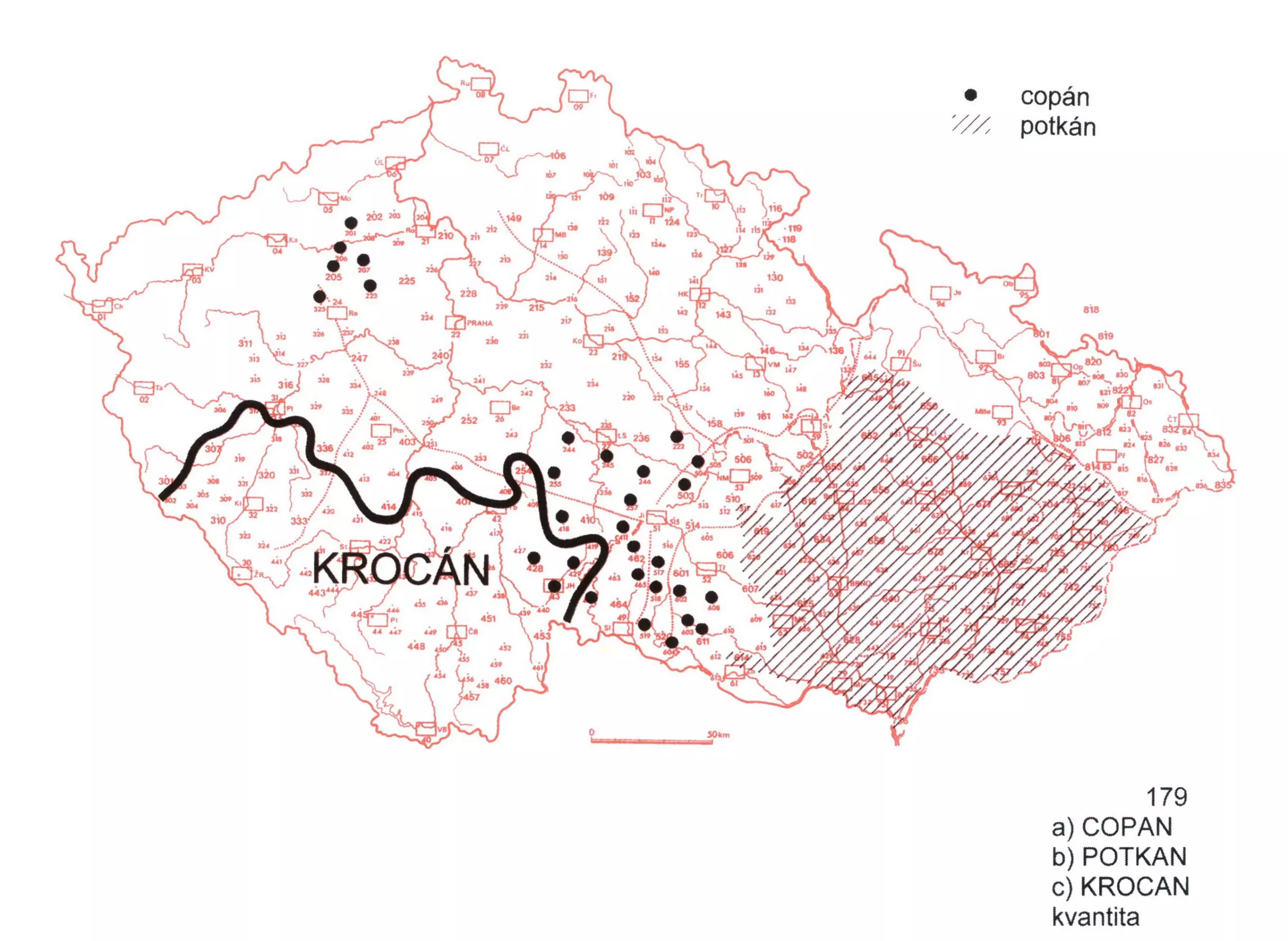 3 Podoba copán pokrývá větší areál v již. části čes.-mor. pomezí (Jindřichohradecko, již. Ledečsko, Jihlavsko, Znojemsko), odděleně je pak doložena ještě ze sev. Rakovnicka. Podoba potkán je typická pro většinu nářečí na Moravě (na západ až po Moravský Krumlov). Varianta krocán zabírá většinu jzč. nář. (bez sev. a sz. okraje).