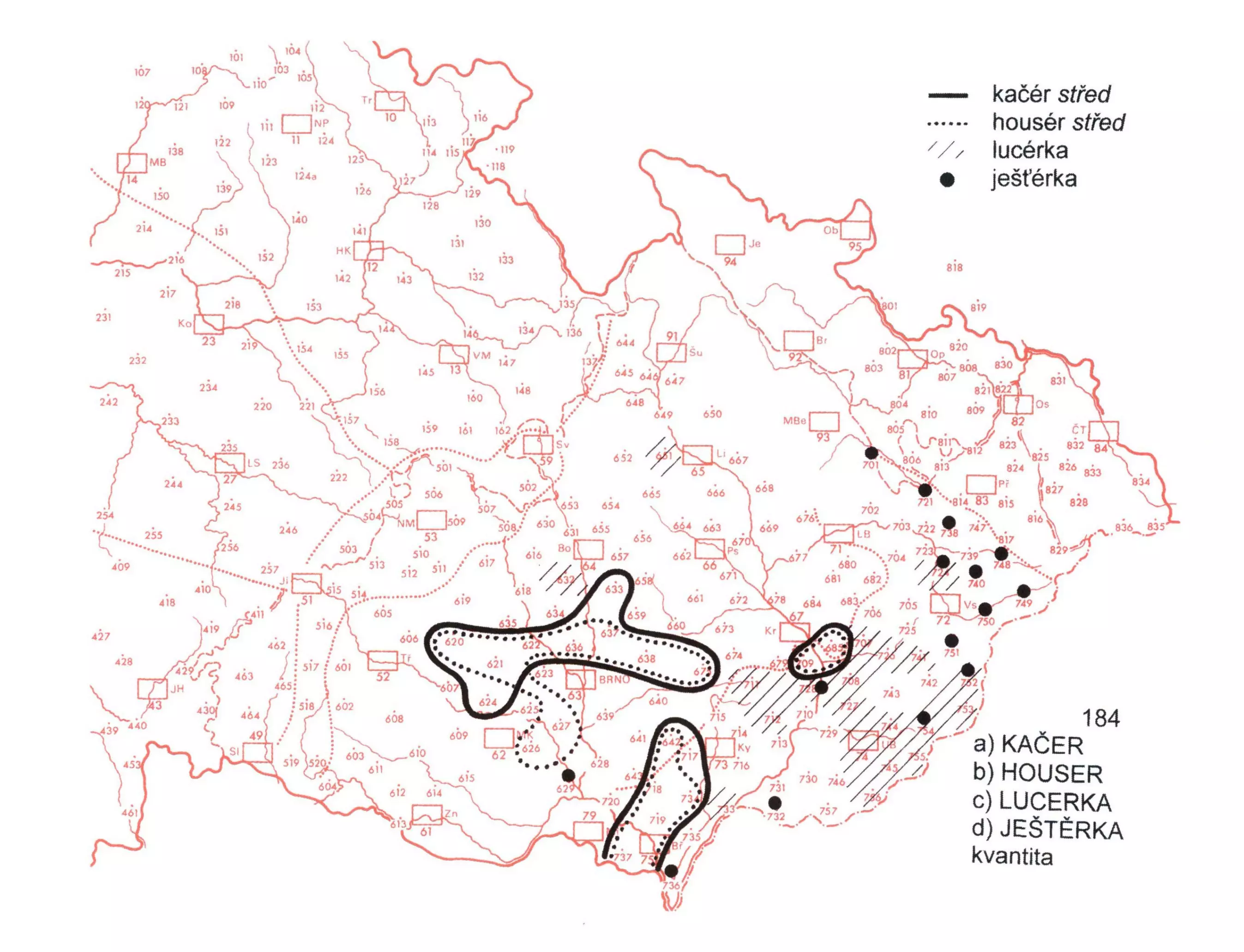 3 Téměř shodné zeměpisné rozšíření mají tvary housér a káčér. Tyto podoby jsou charakteristické pro širší Brněnsko a pro oblast mezi Břeclaví a Kyjovem a pro jv. Kroměřížsko.