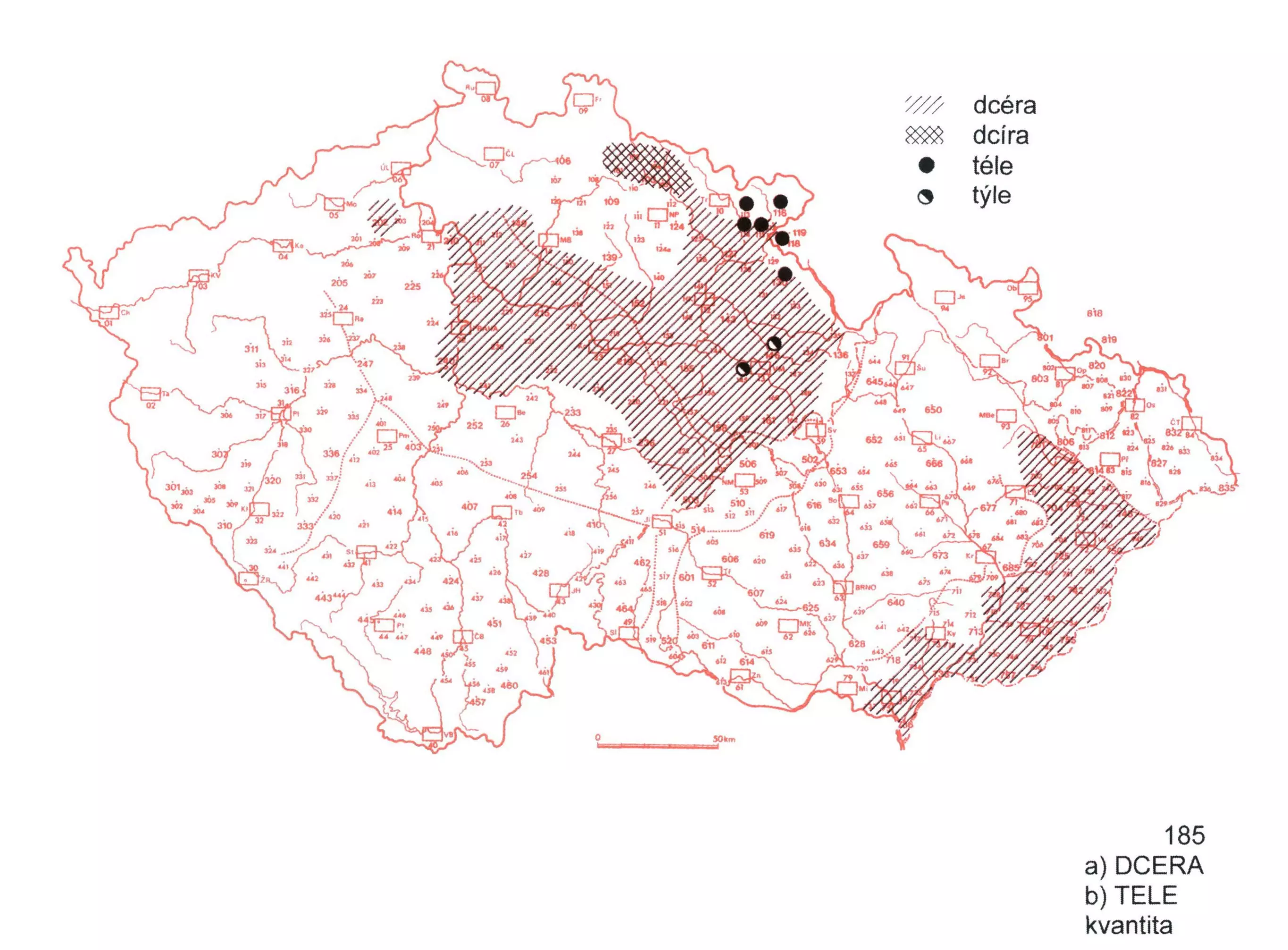 2 Sleduje se rozsah dloužení samohlásky e v pozici před r u výrazu dcera a před l ve slově tele (dcéra, téle) a dále i obměny zúžené dcíra a týle. S ohledem na okrajový či sporadický rozsah rozšíření zúžených podob soudíme, že toto úžení může být sekundární.