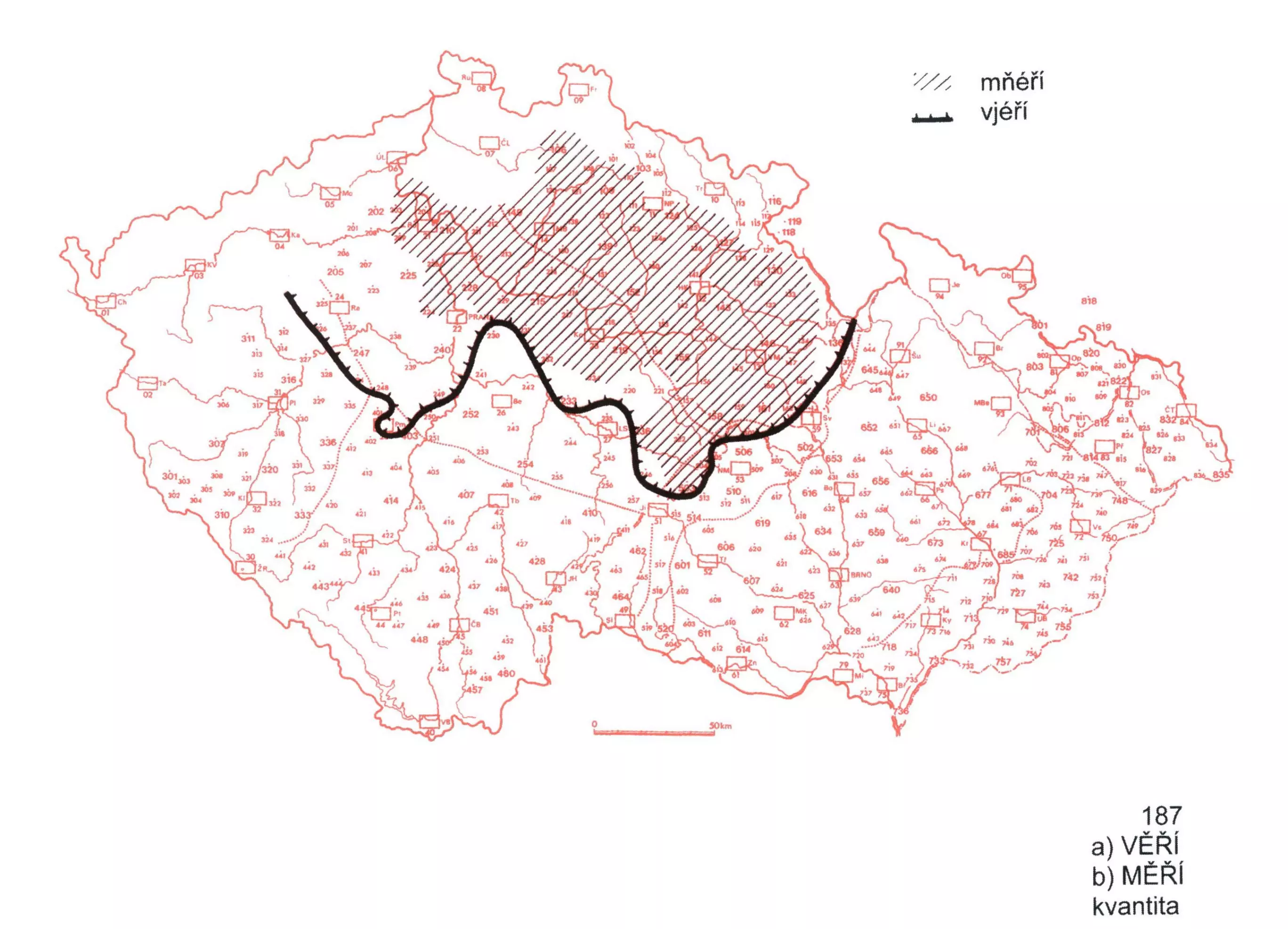 2 Mapa pozitivně zaznamenává oblasti s maximálním rozsahem podob se zdlouženým kořenným é v tvaru 3. os. ind. préz. sloves věřit a měřit.