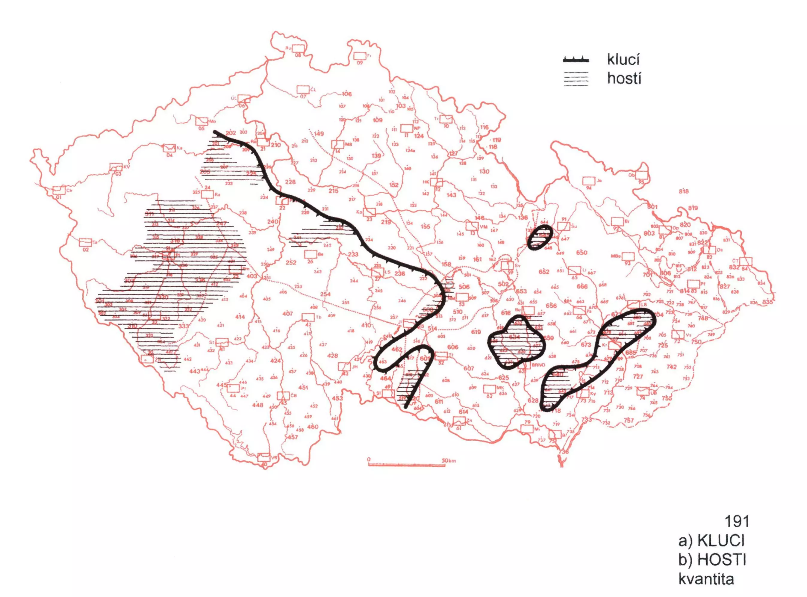 2 Mapa tvaru nom. pl. životného substantiva kluk zachycuje území s maximálním zeměpisným rozsahem formy s koncovkou í (klucí), zatímco areály podoby hostí představují její minimální rozsah.