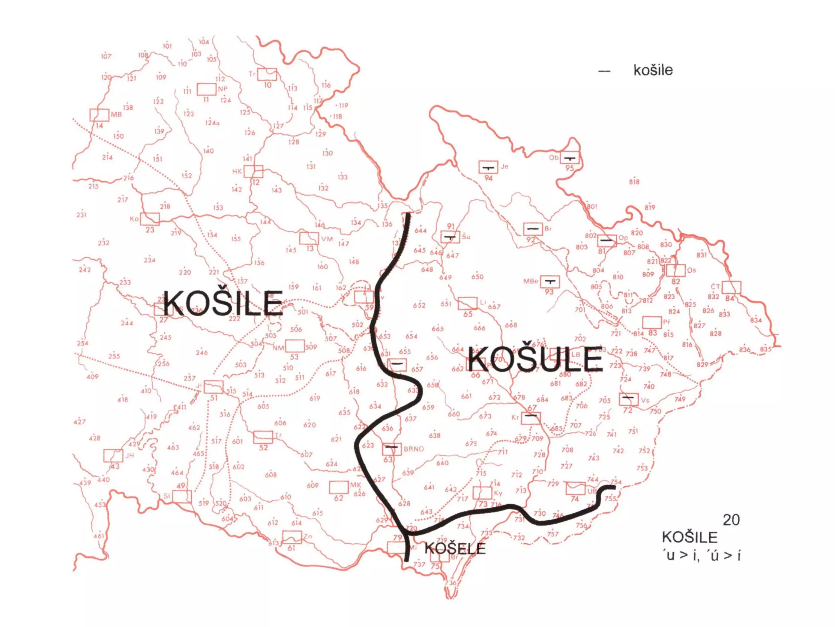 7 S areálem nepřehlasované podoby břuch se shoduje i rozšíření neprovedené přehlásky v kmeni slova kožich, která byla zjišťována na tvaru lok. sg. v kožuchu; zhruba na záp. Slovácku zní tento tvar v kožuše.
