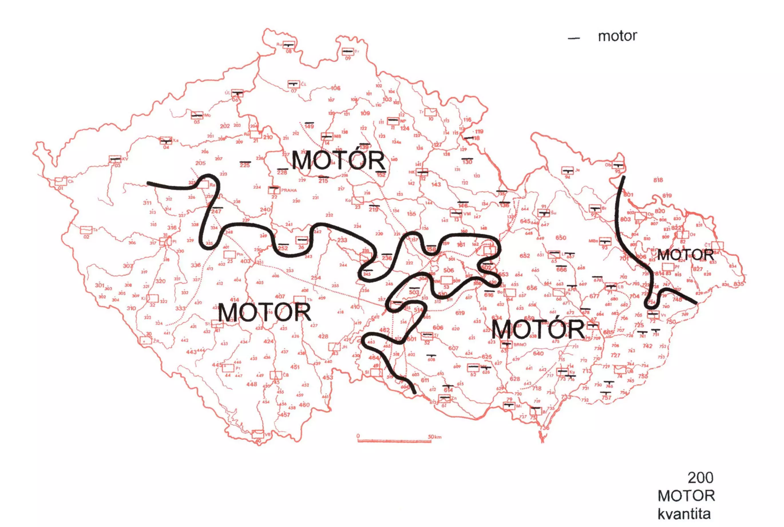 3 Podoba motor, shodná se spis. jazykem, je rozšířena v již. polovině Čech a ve slez. nář. s úzkým výběžkem do oblasti vm. nář., pro ostatní území čes. národního jazyka (tj. sev. polovinu Čech a pro Moravu) je charakteristická dloužená varianta motór.