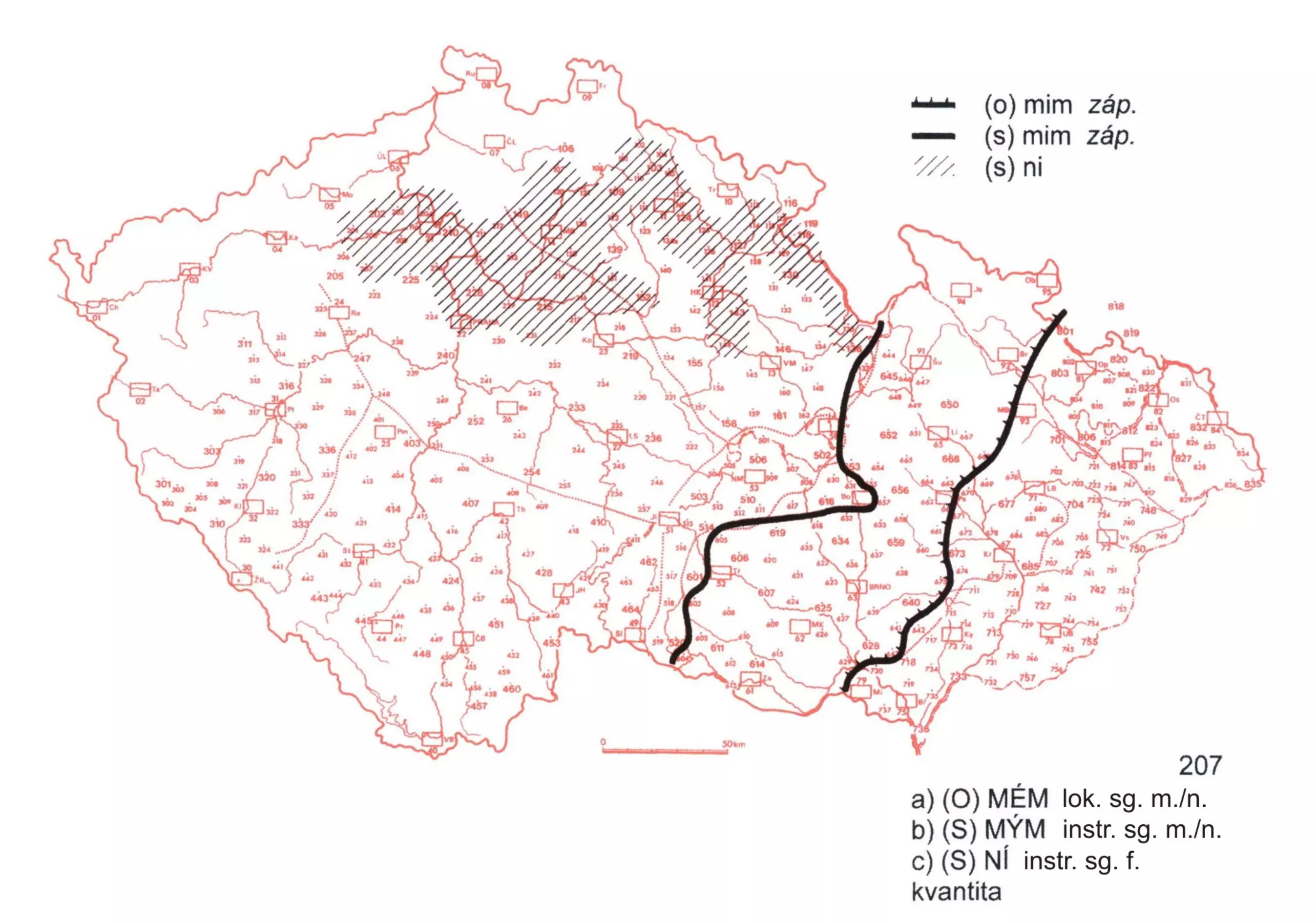 2 Mapa zachycuje východní hranici rozšíření zájmenného tvaru mim v lok. a instr. sg. (nom. můj/mé) a areál s krátkým vokálem v tvaru instr. ni (nom. ona).