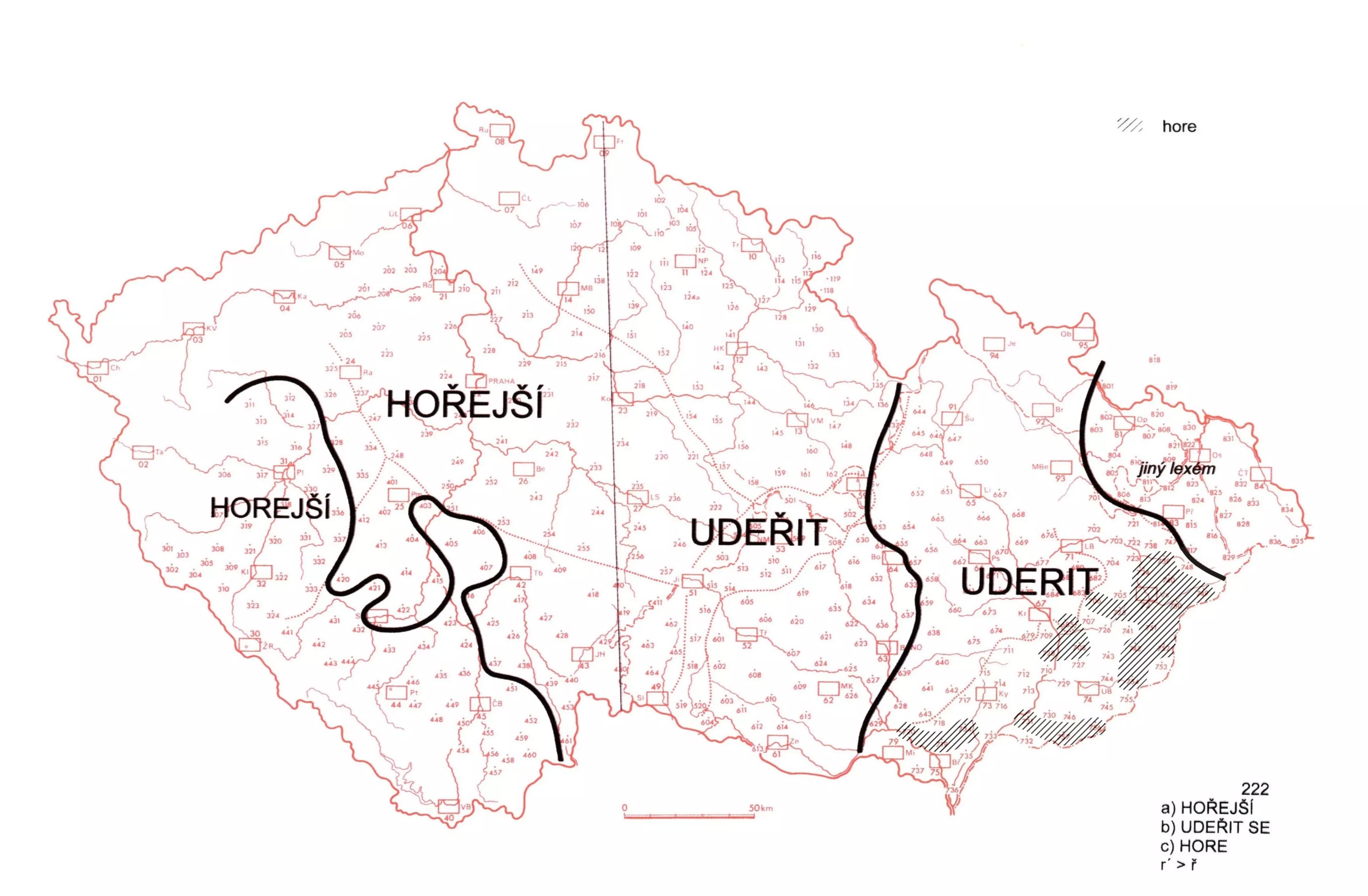 3                 V Čechách se adj. horní obměňuje slovotvorně, viz ČJA 2, 148. Zde sledovanou změnu dokumentuje jen slovotvorná varianta horejšíhořejší). Ta se vyskytuje téměř v celé jzč. nář. oblasti (mimo Příbramsko, Táborsko a Jindřichohradecko).