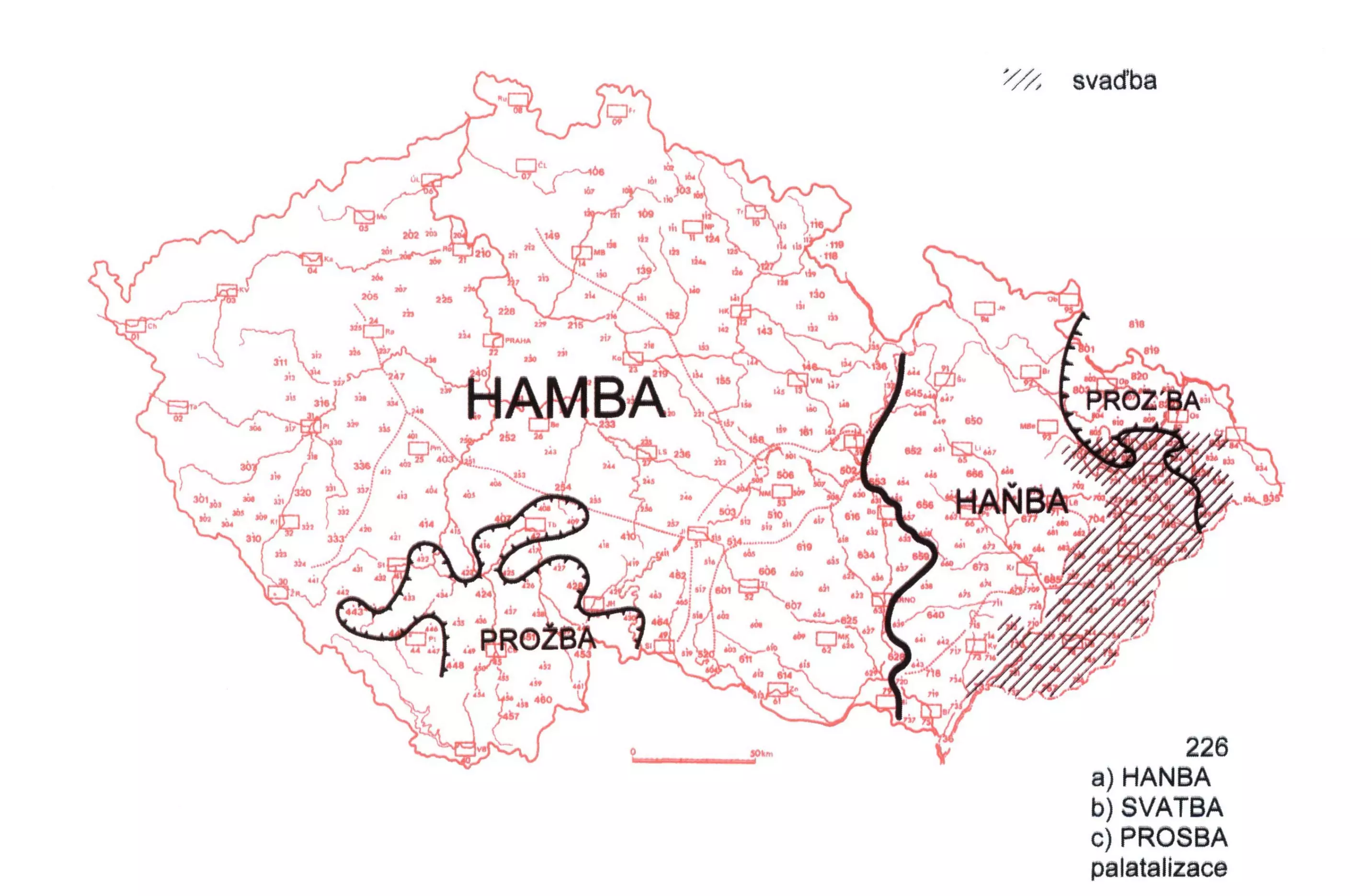 3 Izoglosa hamba, hanba × haňba probíhá ze severu po staré zemské hranici až k Svitavám, odtud míří k Boskovicím, dále k Brnu a Mikulovu. Východně od této linie je běžná varianta haňba.