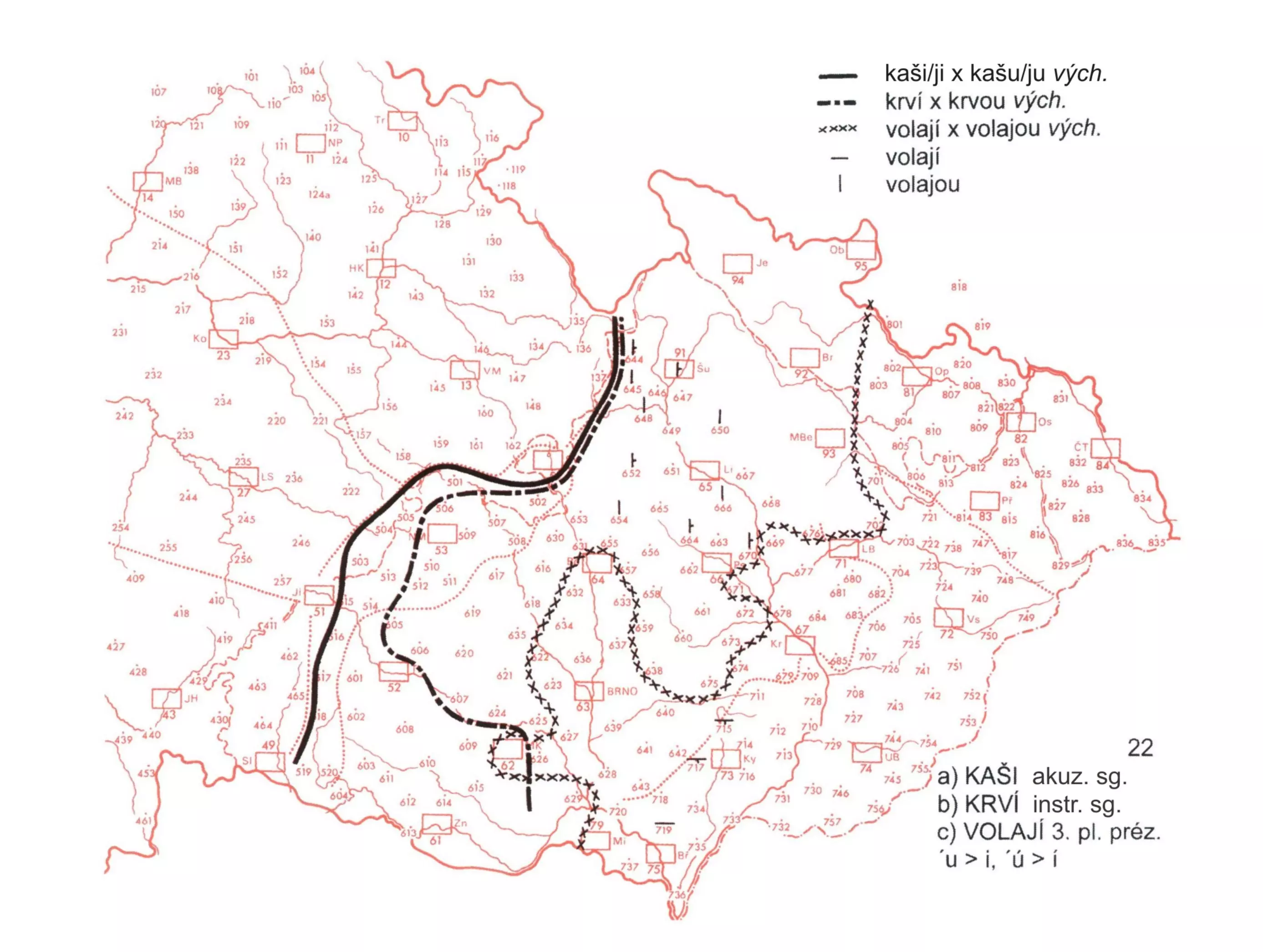 3 Diference přehlasovaných a nepřehlasovaných forem kaši, ji (Čechy) × kašu, ju (Morava a Slezsko) má charakter čes.-mor. protikladu; probíhá zhruba po staré zemské hranici, od níž se odchyluje pouze na jz. Moravě, která se přehlasovanou formou přimyká k Čechám.