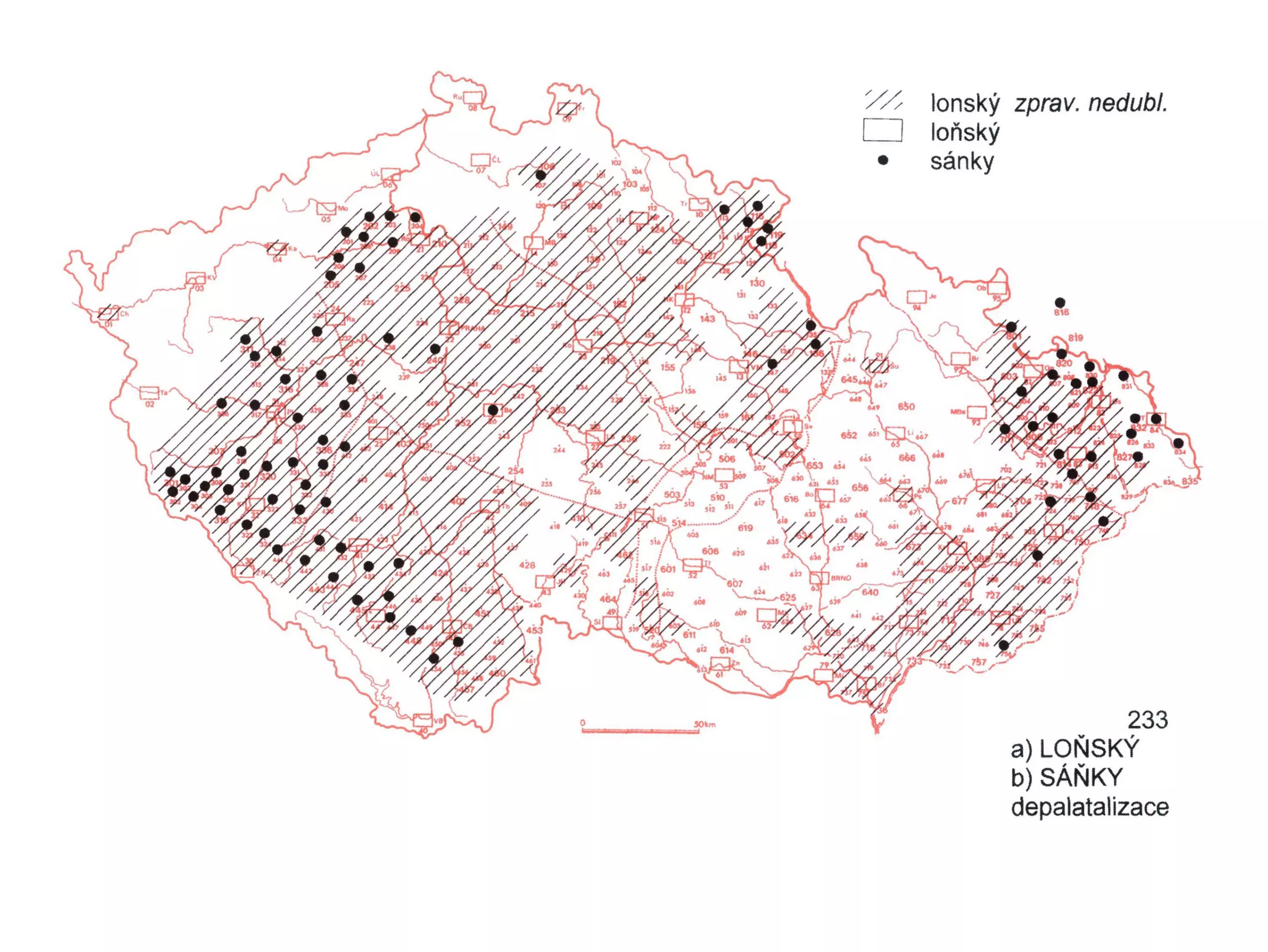 7 Depalatalizovaná podoba konský (< *kon’ьs-) má územní rozložení téměř shodné s areály výrazu lonský, navíc se objevuje ve stř. části čm. nář.