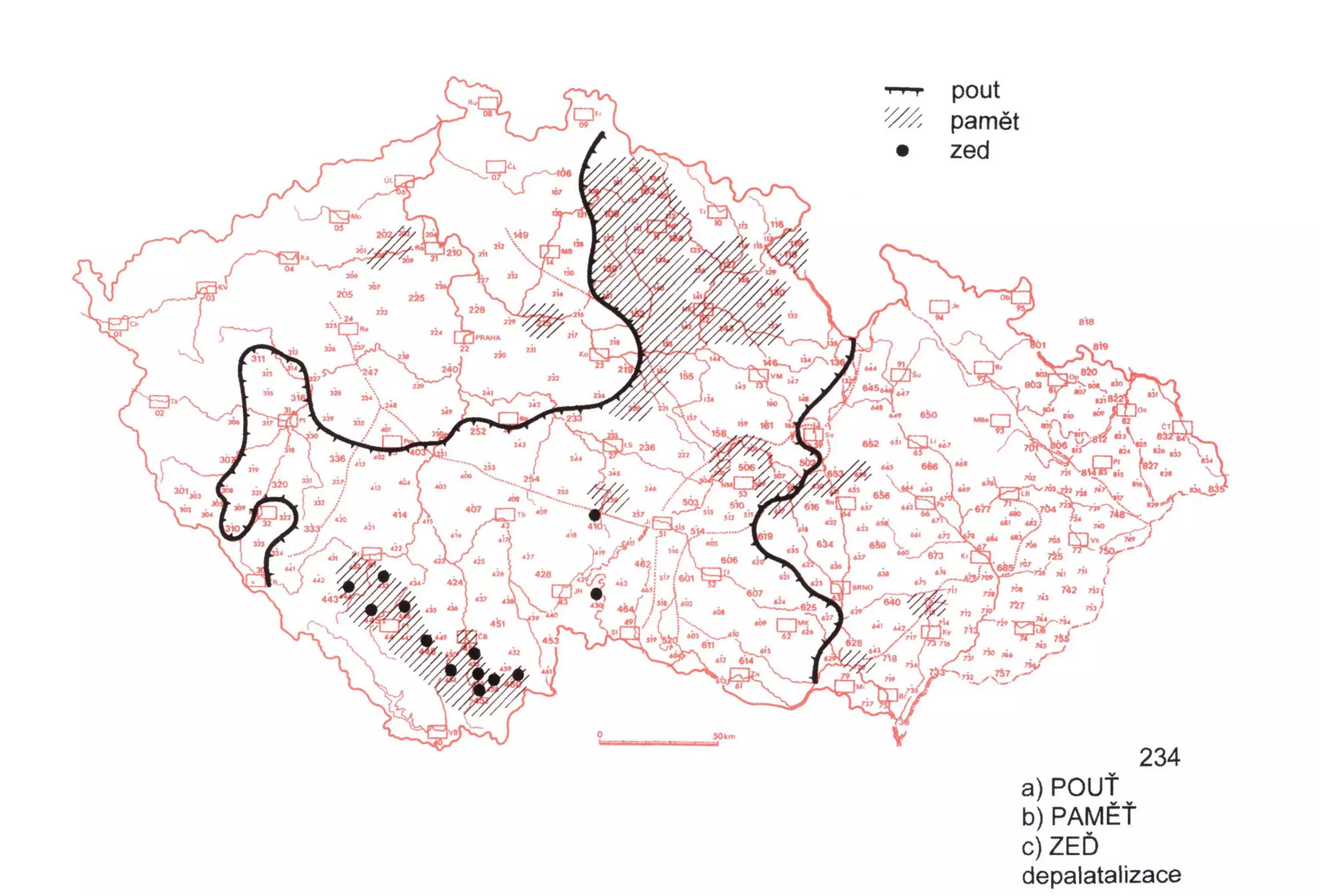 2 Na mapě je pozitivně zachyceno územní rozložení depalatalizovaných podob pout (areály rodových variant srov. ČJA 2, 221 pouť), pamět a zed.