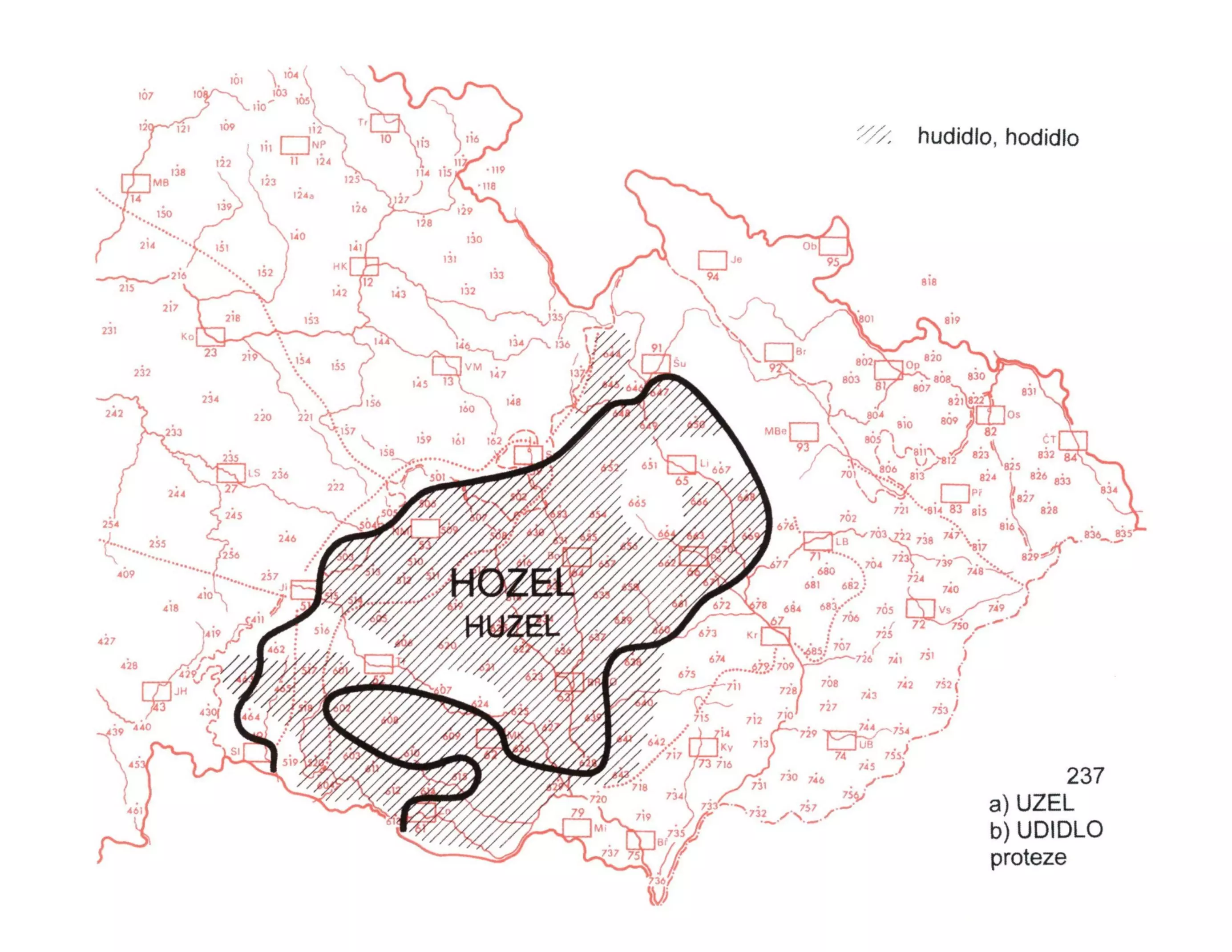 7 Protetickou souhlásku h- máme doloženu též ve výrazech houvar (záp. Morava a záp. Čechy), hušák (střední Morava), hourabky (Plzeňsko), houborek (již. Plzeňsko). Žádné z uvedených slov nepostihuje celý region realizace protetické hlásky, jak jej známe z jiných výrazů, protože příslušné lexémy se vyskytují na menším území, než je území proteze.