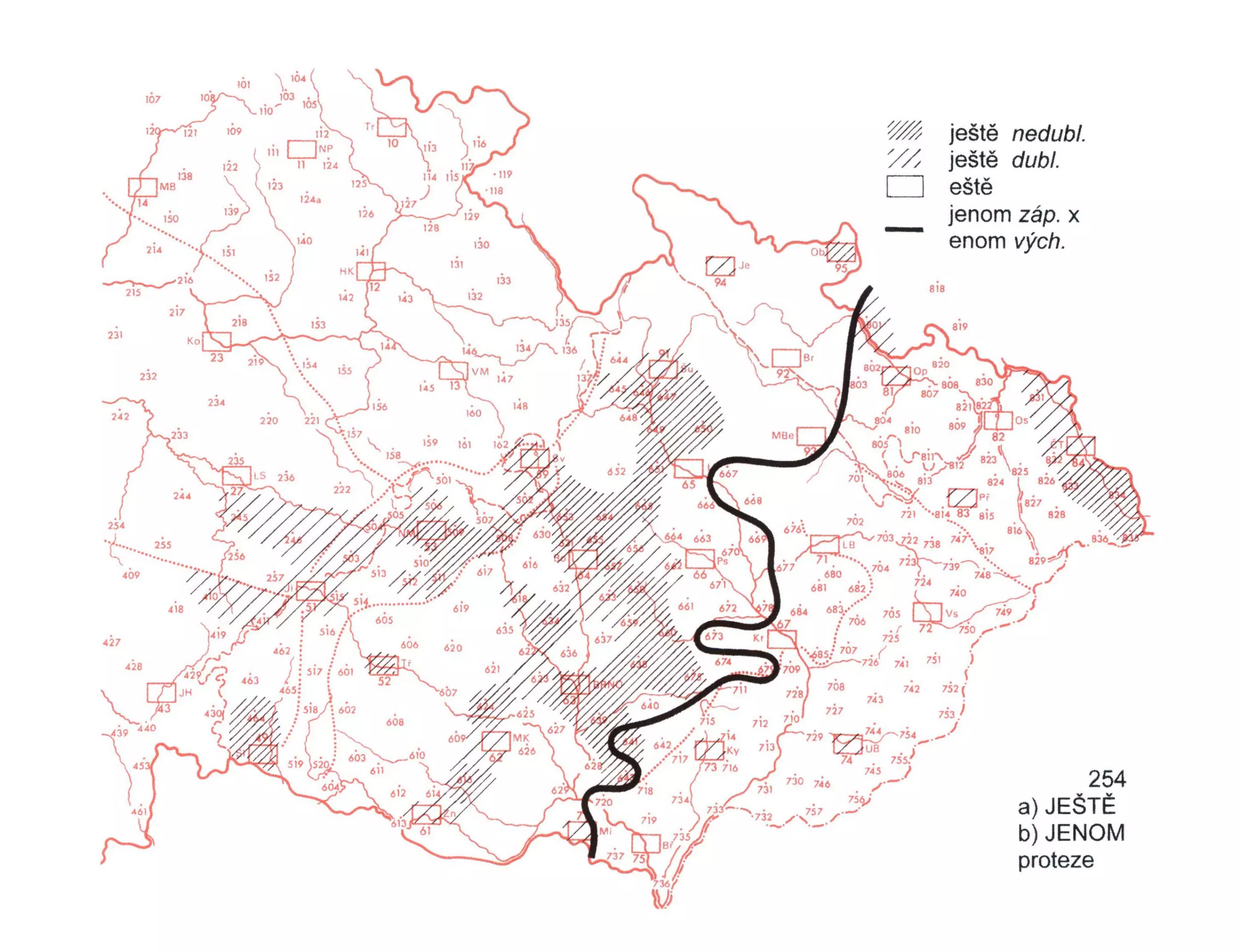 2 Mapa postihuje protiklad variant ještě, jenom, shodných se spis. jazykem, a nář. podob eště, enom. Zánik počátečního j- v těchto a dalších slovech (např. jesli × esli ‚jestli‘) souvisí s výskytem protetického a hiátového j- (srov. ČJA 5, 246; ČJA 5, 248; ČJA 5, 249; ČJA 5, 250; ČJA 5, 251; ČJA 5, 252, ČJA 5, 253).