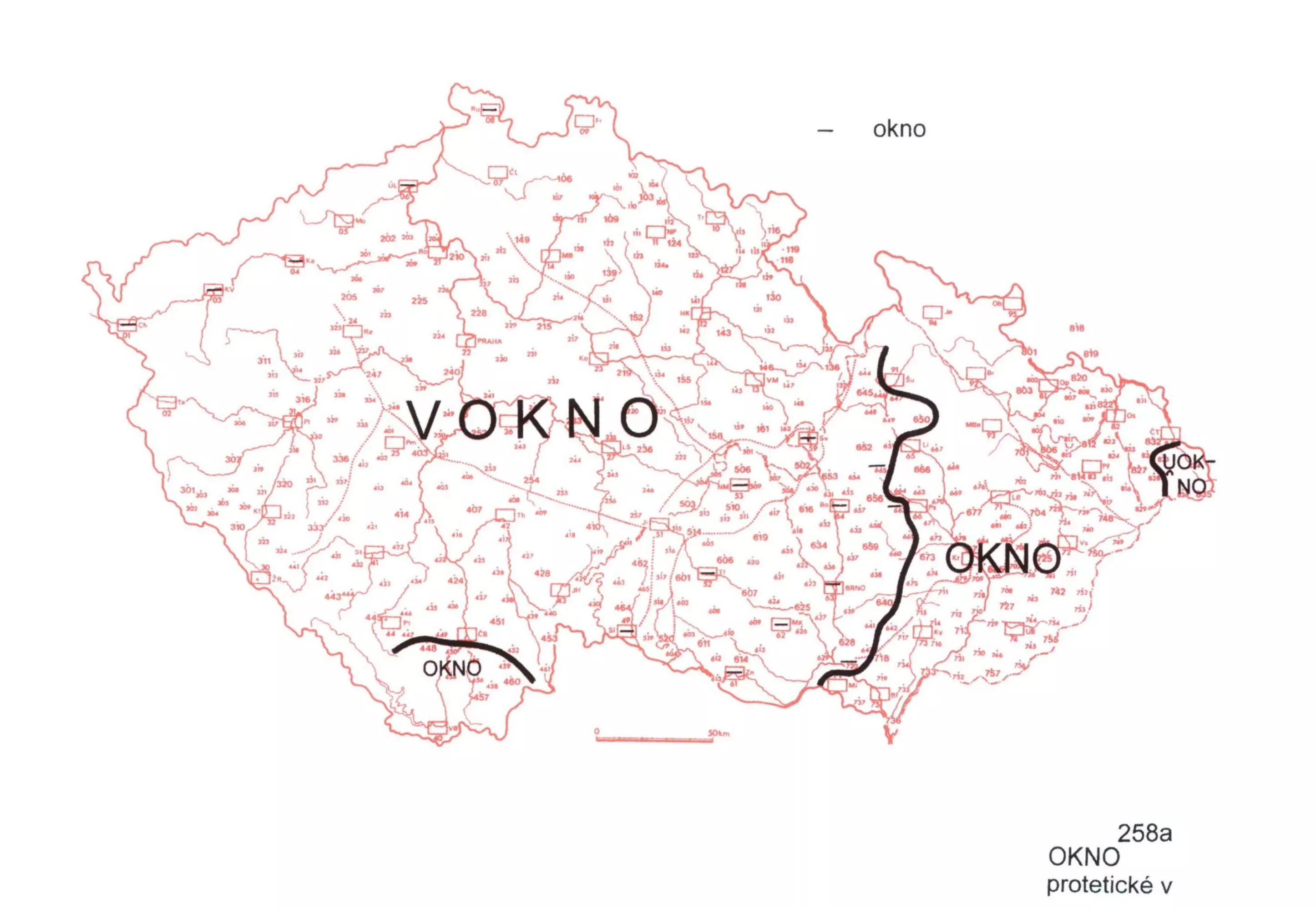 3 Téměř celé Čechy a záp. Moravu pokrývá podoba s protetickým v (vokno), v svč. dialektech místy vyslovované ještě jako bilabiální hláska (wokno). Doudlebsko v již. Čechách a území východně od linie Litovel– Prostějov–Vyškov–Mikulov se liší archaickou variantou bez proteze (často s rázem).