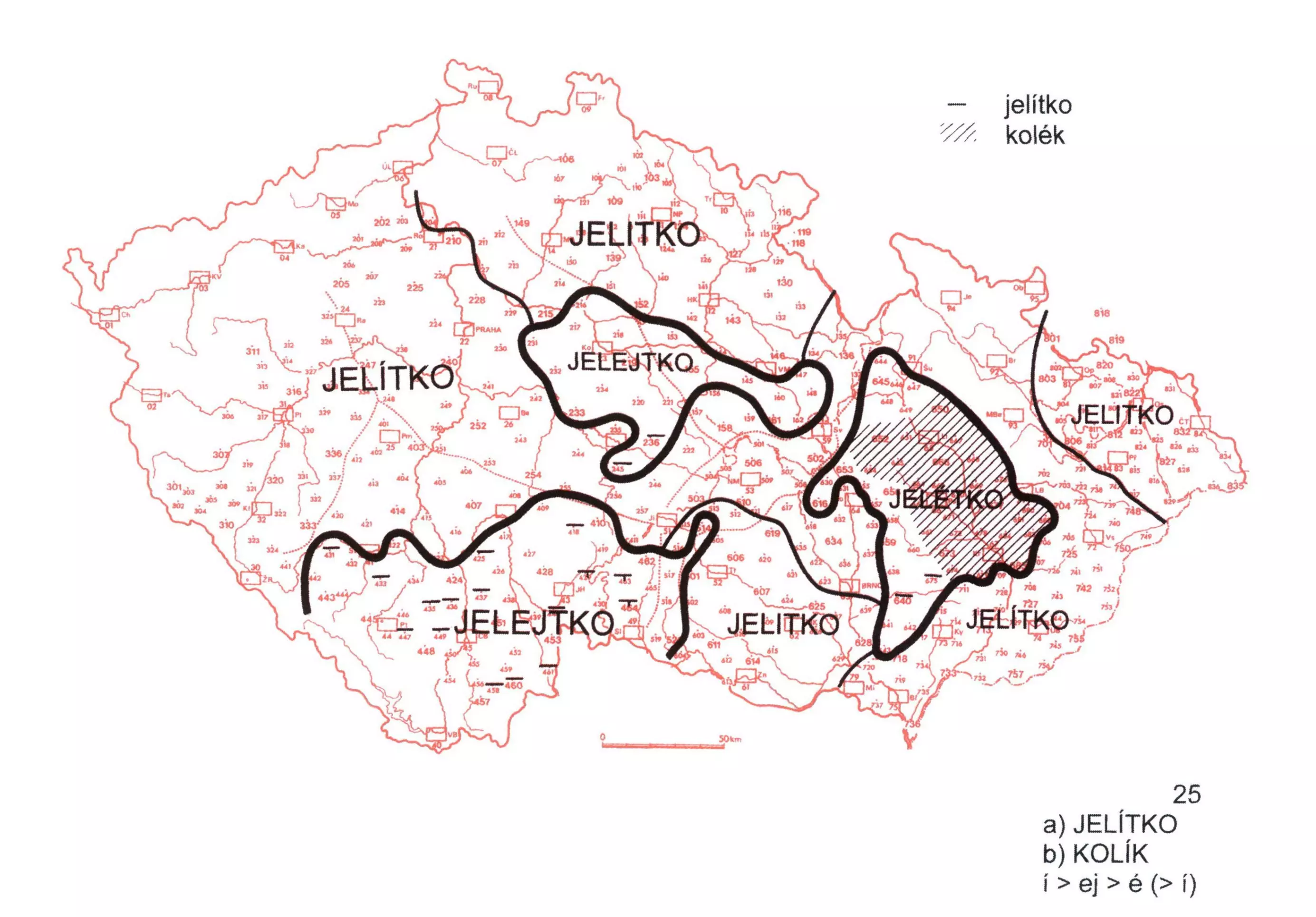 2 Územní rozsah změny í > ej > é po souhlásce l u slova jelítko se poněkud liší od realizace uvedené změny v jiných slovech. Na mapě nesledujeme hláskoslovné obměny jelytko, jolytko, jalitko, lelitko, jejich výčet viz v 1 M.