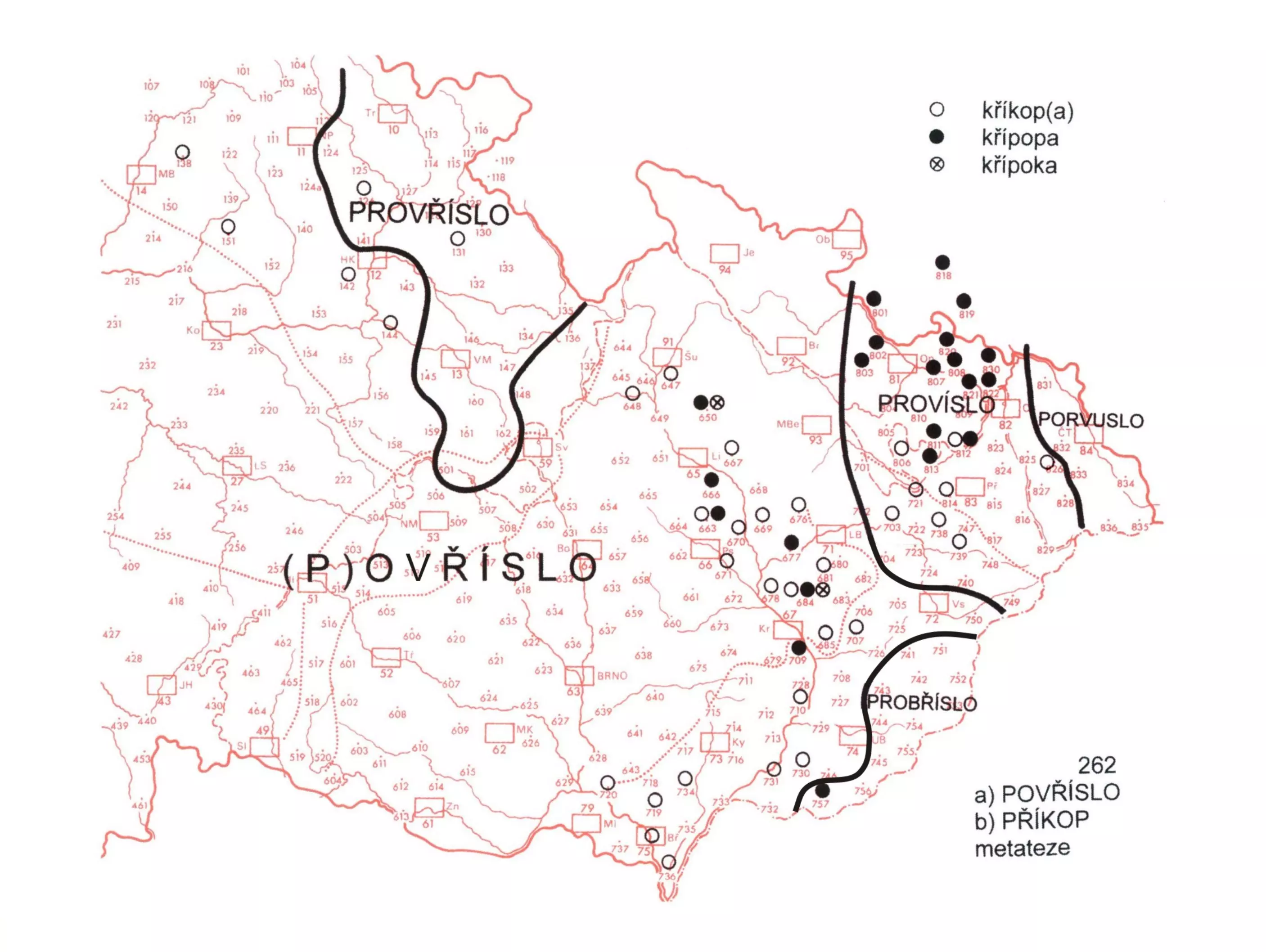 3 Varianty s pro- zabírají vých. část svč. nářečí (provříslo), dále sev. úsek vm. nářečí (tady v obměnách probříslo, provříslo, prohříslo) a záp. část slezských nářečí s přilehlým sev. okrajem vm. dialektů (zde províslo,