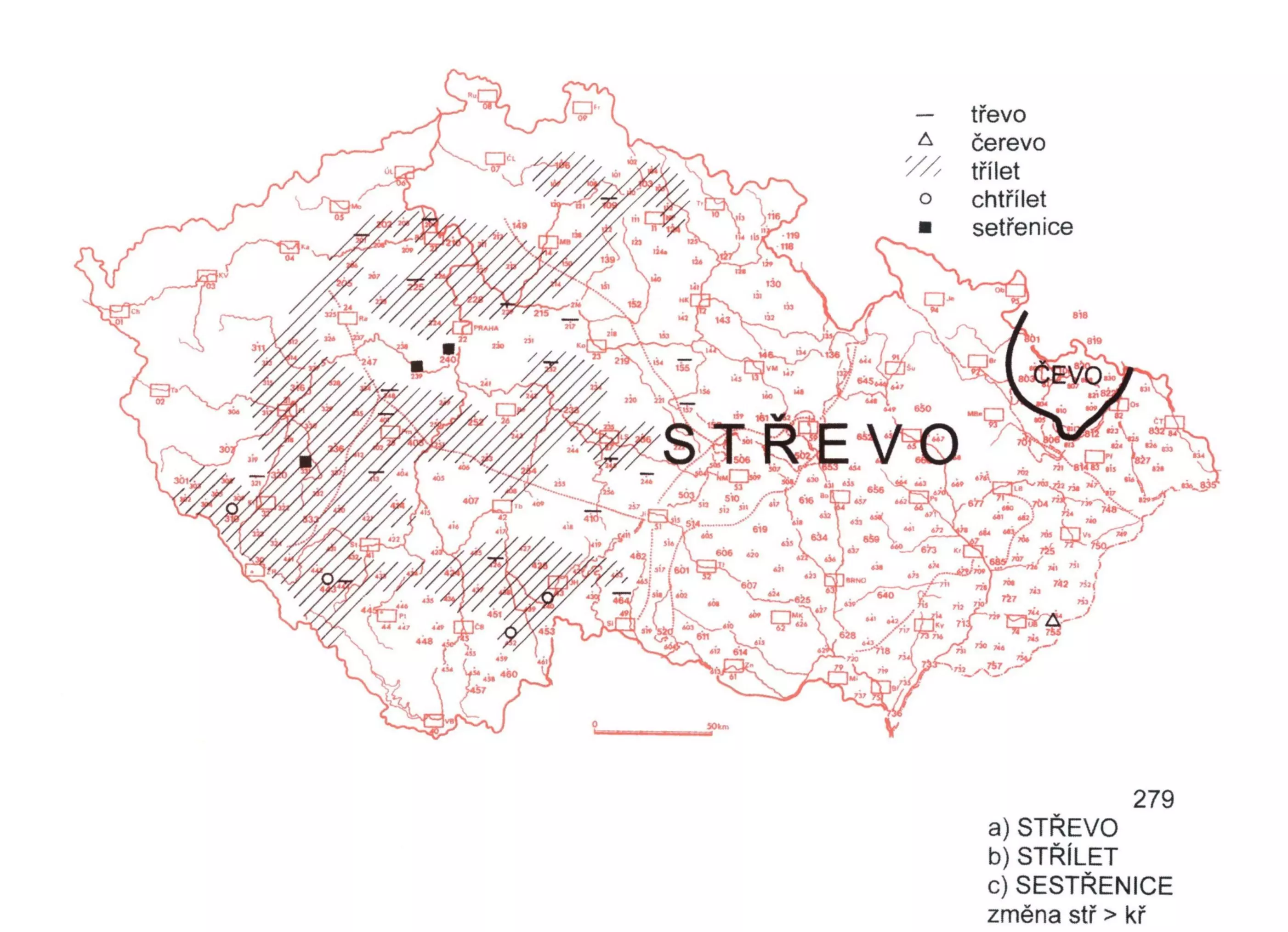 3 Podoba střevo je dominantní na celém zkoumaném území, jen na Opavsku a Hlučínsku se obvykle vedle ní vyskytuje též obměna čevo. Varianta čerevo je doložena pouze ze sev. úseku kopaničářských nářečí. Obměna třevo byla zachycena v jzč. a střč. nářečích, protože však byla položka zkoumána v Čechách na opěrné síti, spokojujeme se zakreslením pomocí značek. Její zeměpisné vymezení je tedy podáno pouze přibližně.