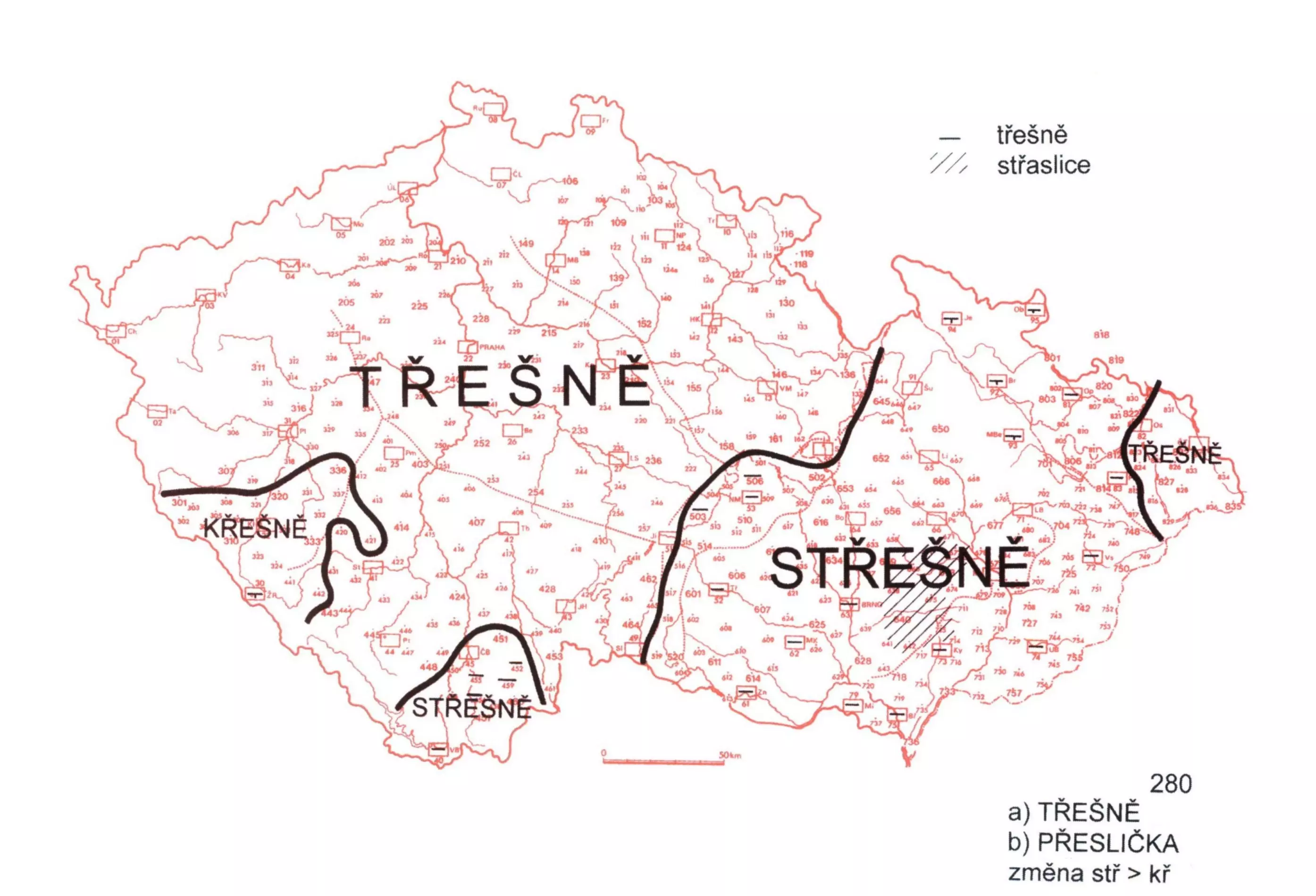 3 Hlavní izoglosa mezi podobami třešně a střešně probíhá zhruba podle staré zemské hranice, od Jihlavy se stáčí více k východu přímo na Slavonice. Forma střešně charakterizuje moravská nářečí, třešně nářečí v Čechách. Podoba střešně vytváří ještě mikroareál na Českobudějovicku, naopak podoba třešně se dokládá i z vých. slezské podskupiny. Celkový zeměpisný obraz dotváří menší areál formy křešně. Ten se nachází na širším Klatovsku s Chodskem.