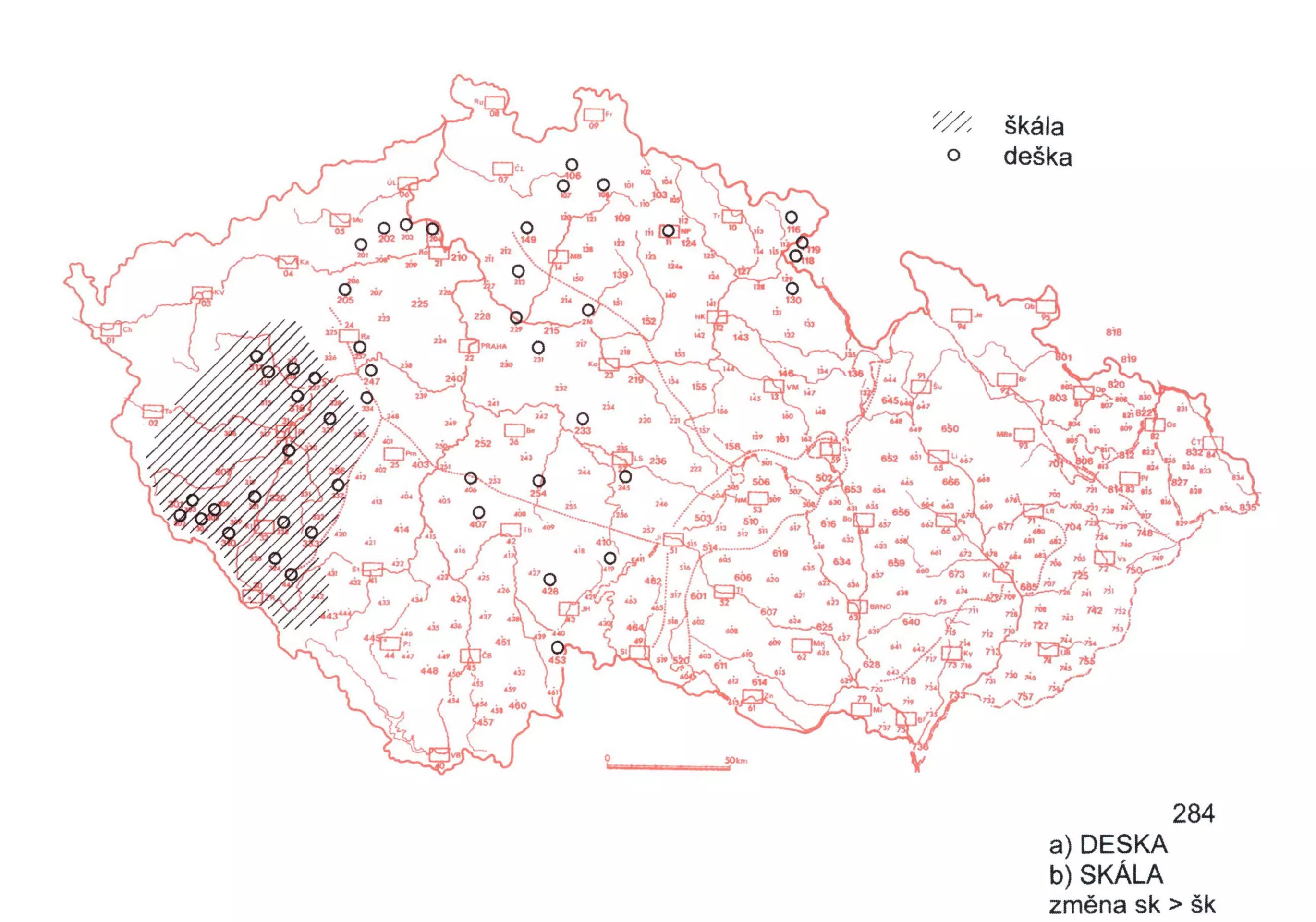 2 Nář. hláskoslovnou změnu sk > šk představujeme také na slově deska. To má v nářečích významy ‚prkno‘ a ‚dužina u sudu‘, srov. ČJA 1, 200. V tomto druhém významu je však slovo deska rozšířeno jen v záp. a sz. Čechách. Tam má většinou hláskovou podobu deška. Ve významu ‚prkno‘ se výraz deska (jen v této podobě) užívá pouze na Moravě a ve Slezsku, srov. ČJA 1, 221/3. Slovu deska byla v Dotazníku věnována samostatná položka zaměřená právě na jeho fonetickou realizaci. Ta však byla v Čechách zkoumána pouze na opěrné síti, proto ani z ní není možné přesný územní rozsah změny sk > šk dobře vyčíst. V omezené míře bylo možno využít zápisů slova deska (× deška) jako nář. ekvivalentu pro pojmenování odhrnovačky, srov. ČJA 3, 39, a šárky, srov. ČJA 3, 135.