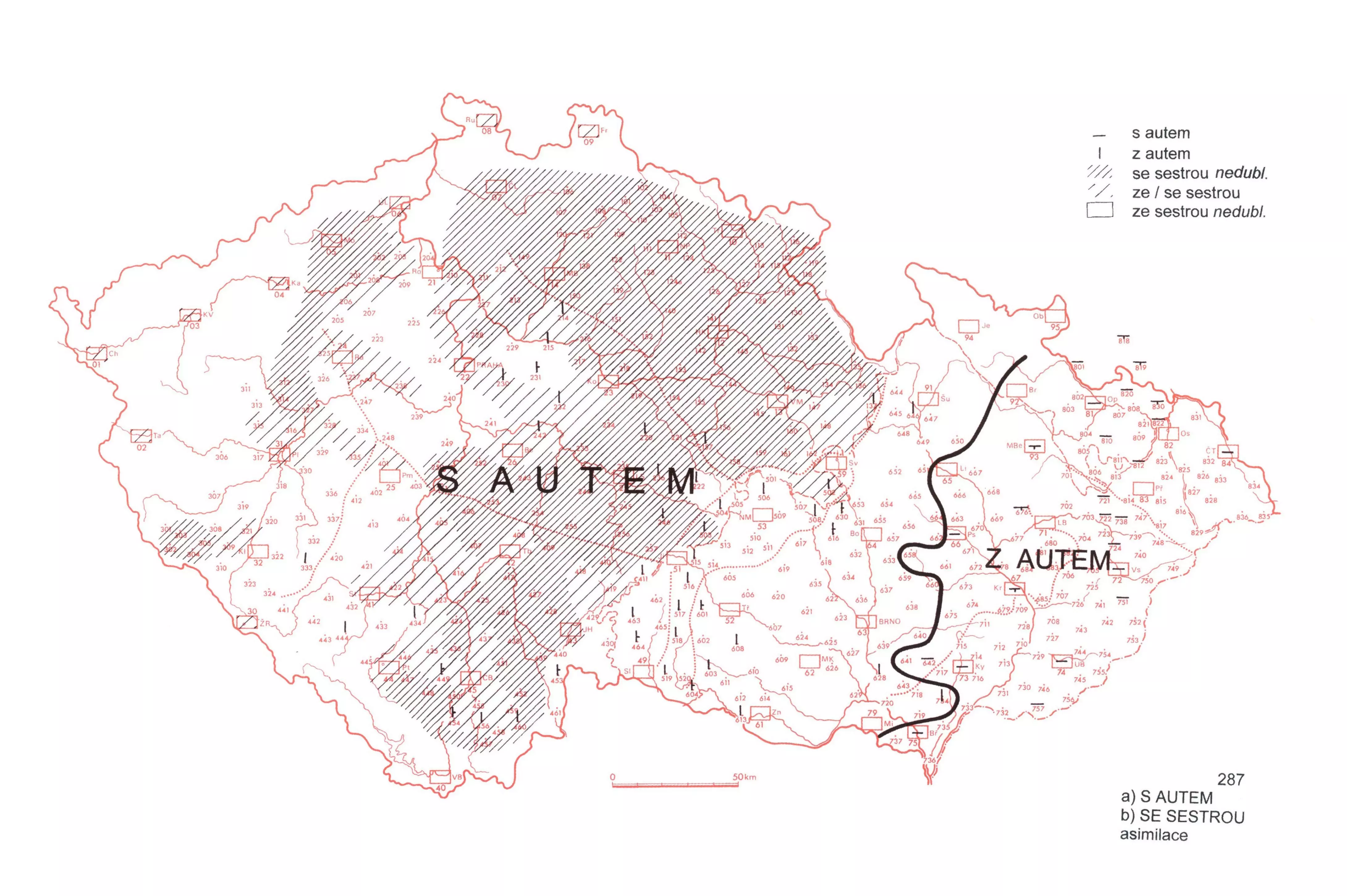 3 Spojení s autem se užívá jako základní po celých Čechách a na záp. polovině Moravy; pro vých. polovinu Moravy (od linie Litovel–Břeclav) a pro celé Slezsko je charakteristická varianta z autem. Místy byly zapsány dublety, a to podoba z autem v oblasti střč., čm. a na jihu nář. jzč., podoba s autem pak častěji na Hlučínsku a na sev. Vsetínsku a také v mluvě většiny měst ležících v areálu varianty z autem.