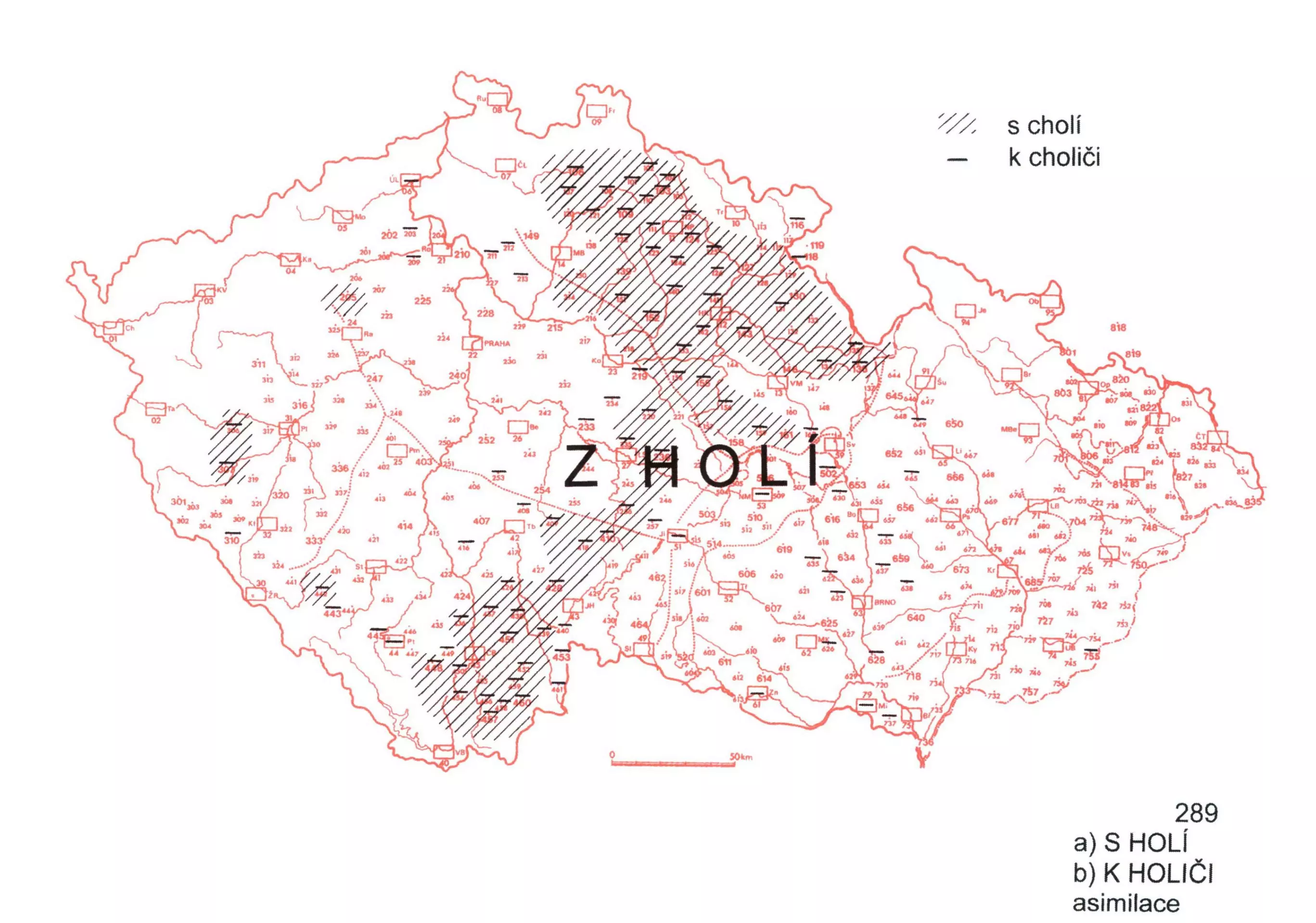 2 Mapovaly se případy asimilace ve spojení předložka s, k + subst. s náslovným h (typu s holí a k holiči). K oddílu pojednávajícímu o regresivní asimilaci je přiřazujeme z hlediska ryze formálního, výrazné nářeční podoby s cholí a k choliči jsou samozřejmě výsledkem asimilace progresivní. Mapa zachycuje protiklad z holí × s cholí, u předložkového spojení k holiči pak jen nářeční podobu k choliči. Nář. formy s cholej (< -í) a k choličoj (< -ovi) se zde nesledují, srov. ČJA 4, 88 díží, ČJA 4, 89 krví a ČJA 4, 53 sousedovi, ČJA 4, 54 pekaři, ČJA 4, 55 soudci.