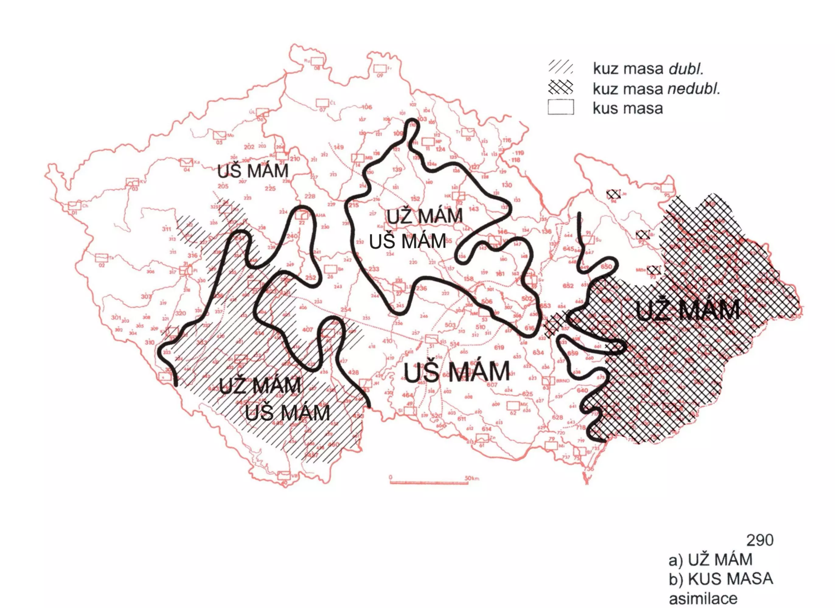 2 Zkoumala se asimilace znělosti párových souhlásek před hláskou jedinečnou ve spojení už mám a kus masa. Mapa zachycuje protiklady podob uš mám × už mám a kus masa × kuz masa.