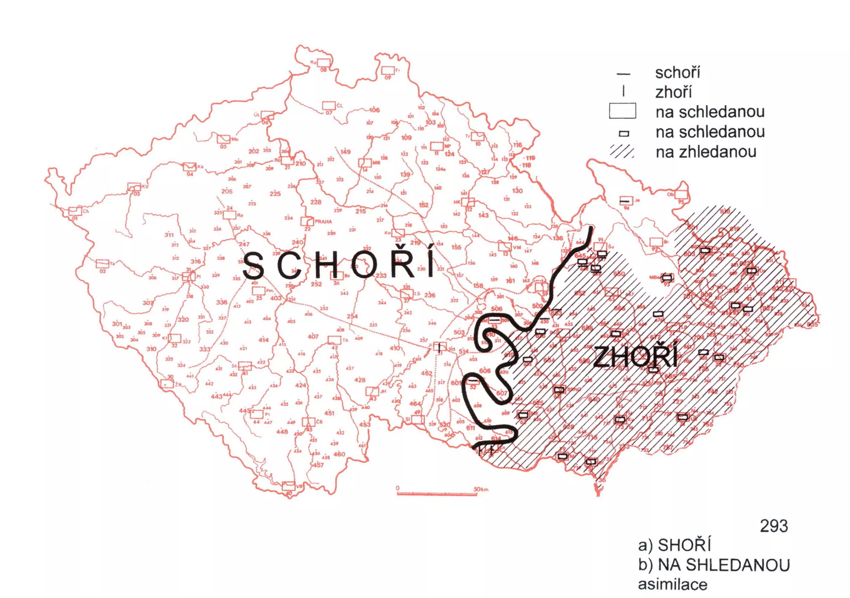 3 Případy progresivní asimilace (schoří, na schledanou) jsou typickými českými variantami, podoby zhoří a na zhledanou, které vznikly jako důsledek asimilace regresivní, se vyskytují na Moravě (izoglosy vydělující oba moravské areály přičleňují k Čechám v nestejně velkém územním rozsahu i Třebíčsko a Znojemsko). „Česká“ varianta na schledanou byla zachycena (jako dubletní a nověji pronikající) i ve většině moravských měst.