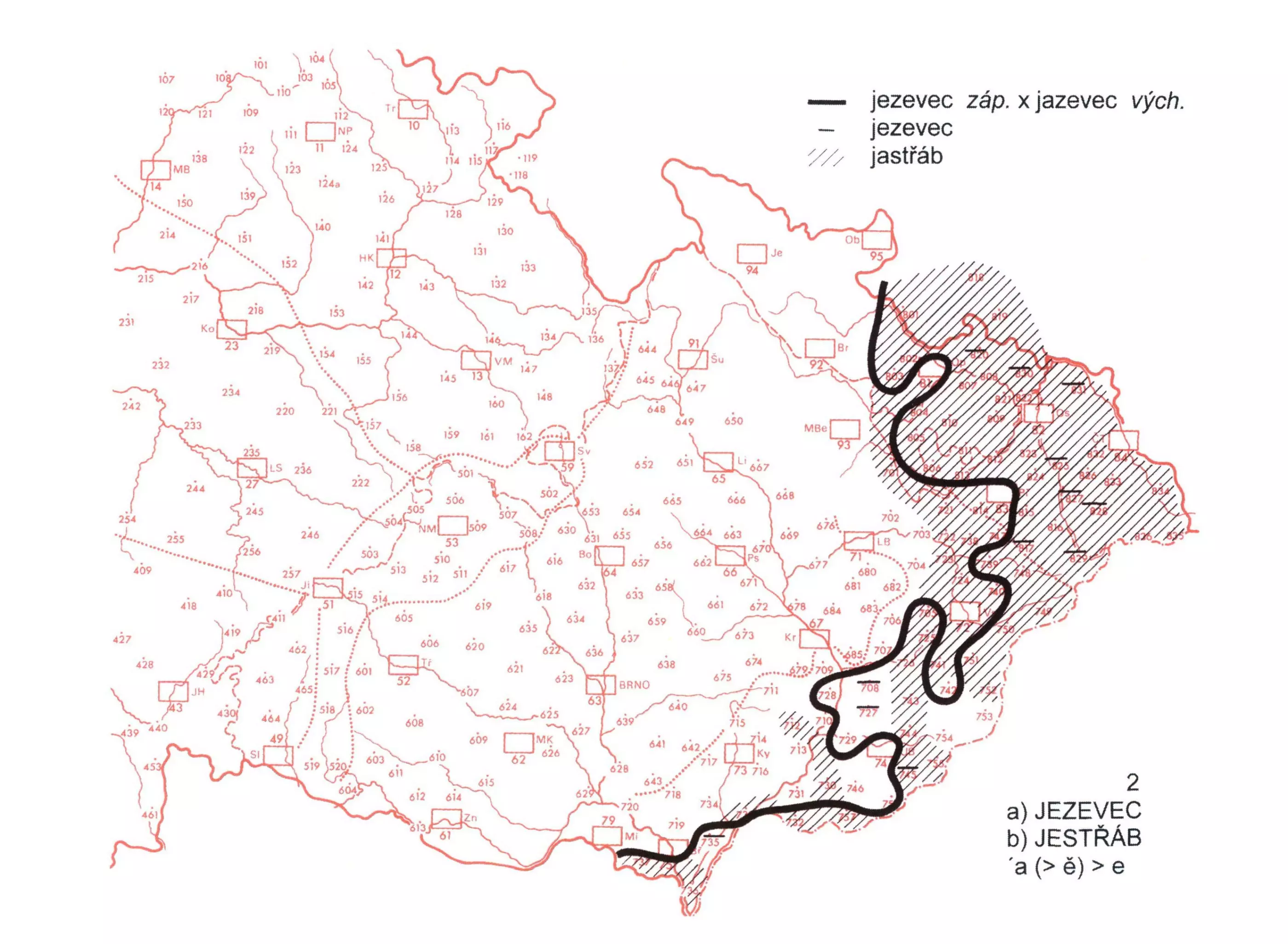 Izoglosou je vymezen protiklad podob jezevec a jazevec (psl. *jazvьcь, jazvovьcь), pozitivně šrafami je zobrazena nepřehlasovaná varianta jastřáb (psl. *jasъtrębъ).